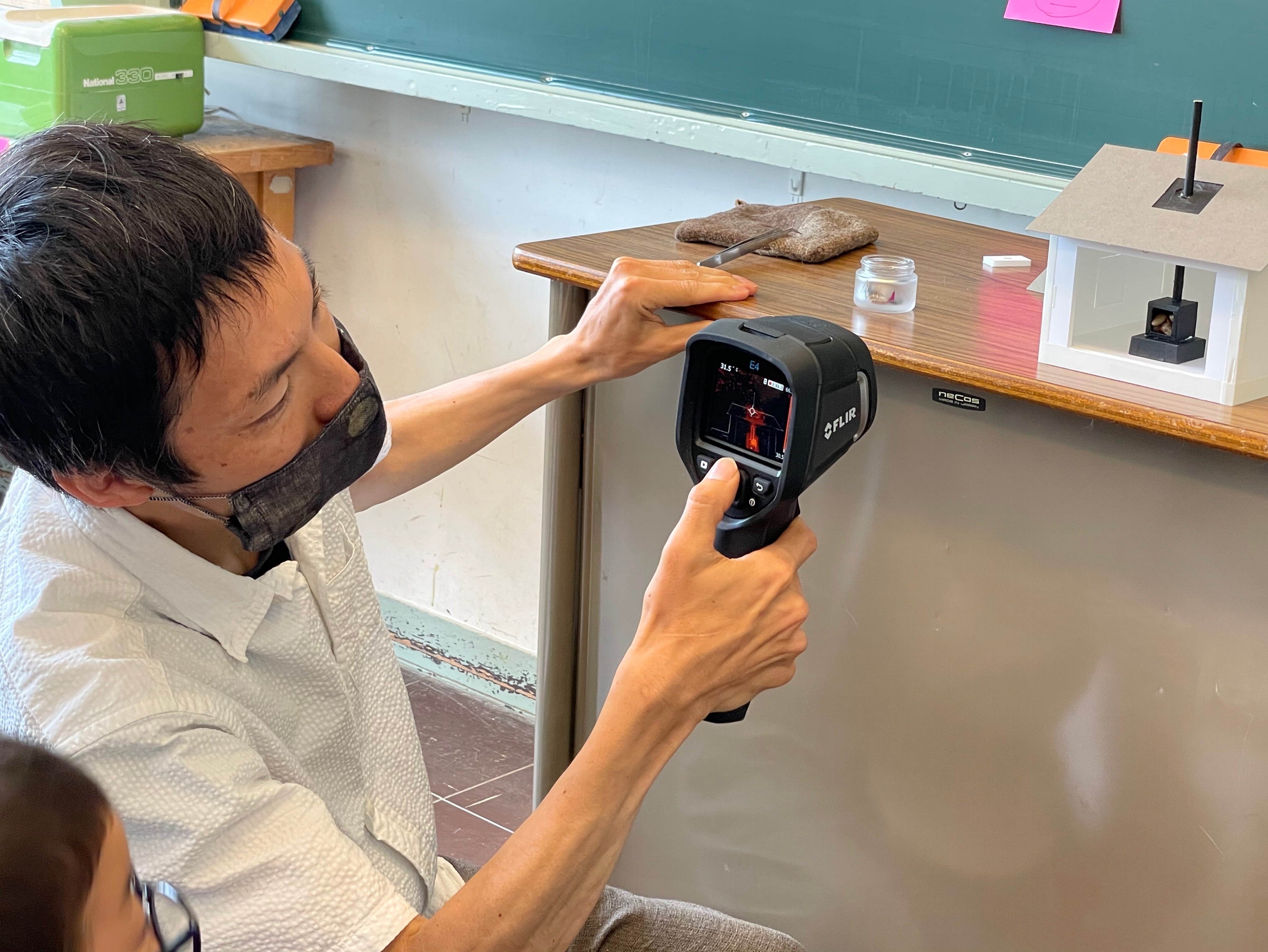 模型ができたら、アツアツの石をストーブの中に入れて、サーモカメラで熱の動きを見ていきます。
