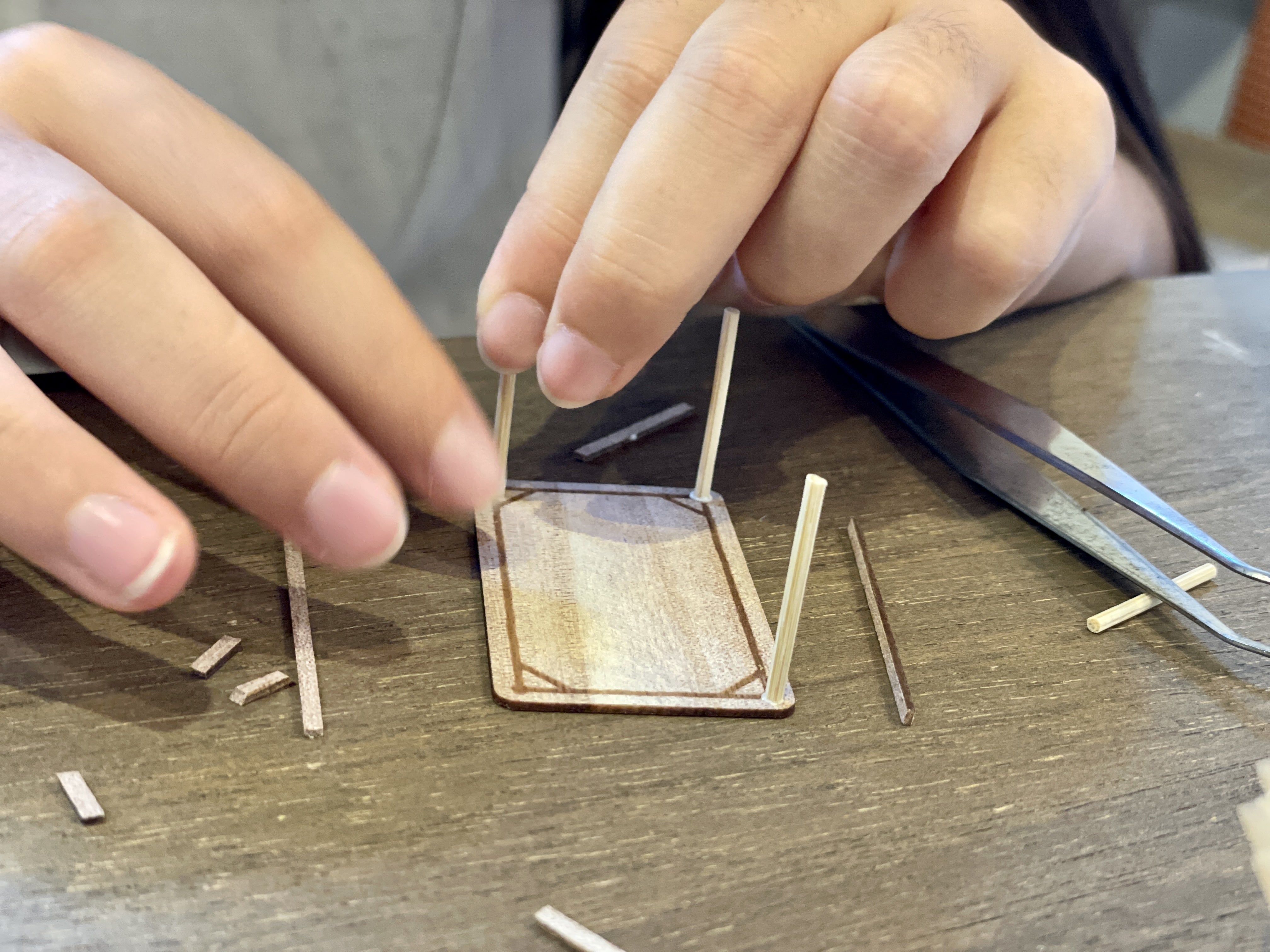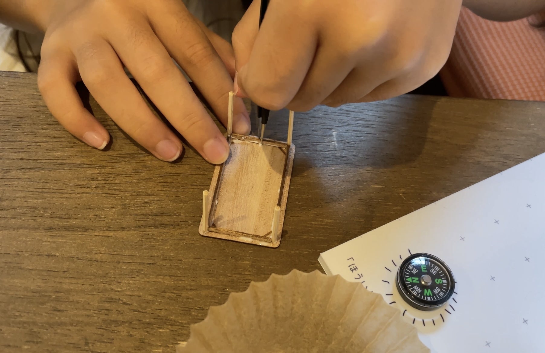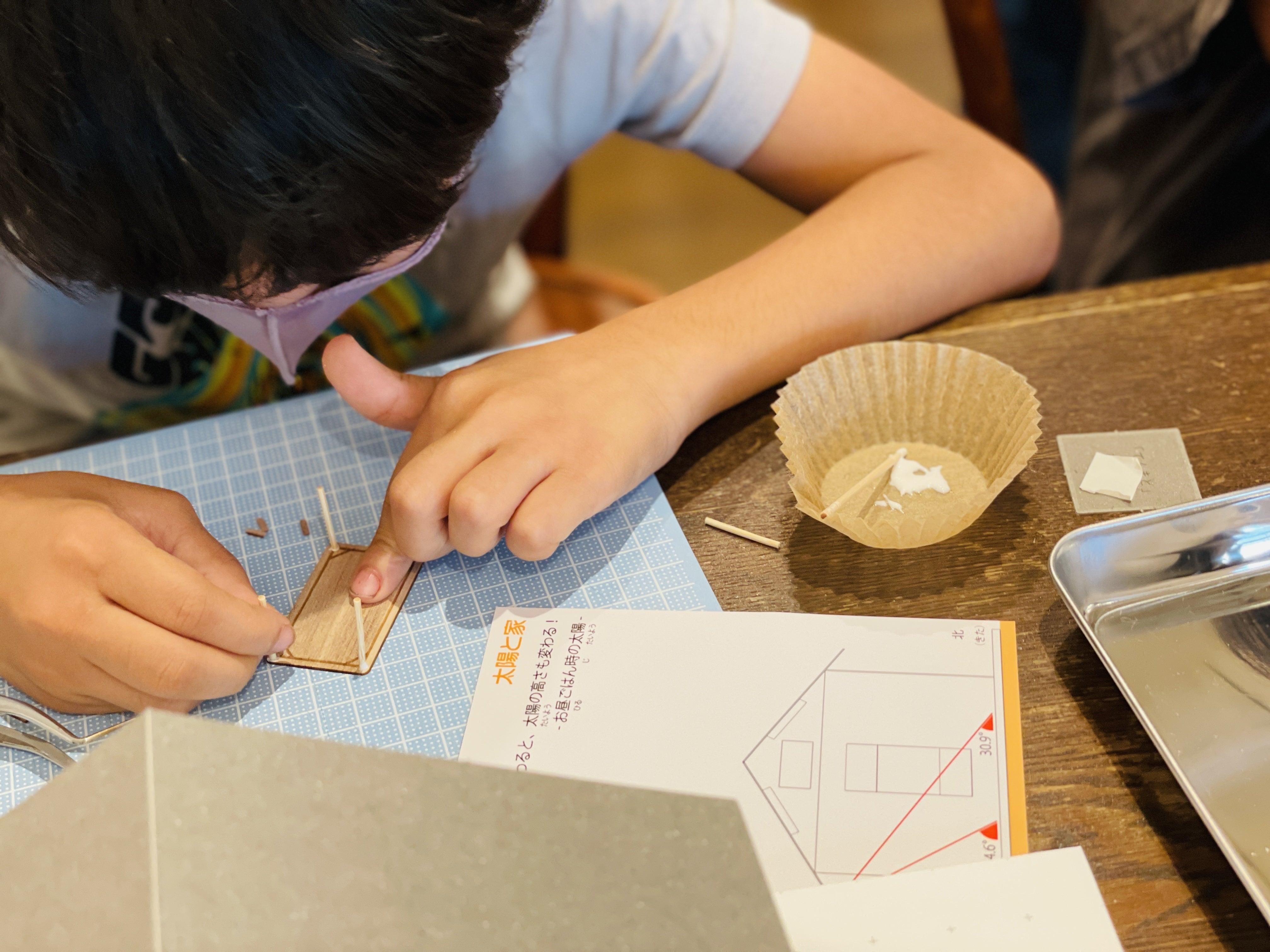 細かな作業で、老眼入った私たちには辛いですが笑、子供たちは天板に足→幕板→隅木と、黙々と上手に組み上げて行きます。