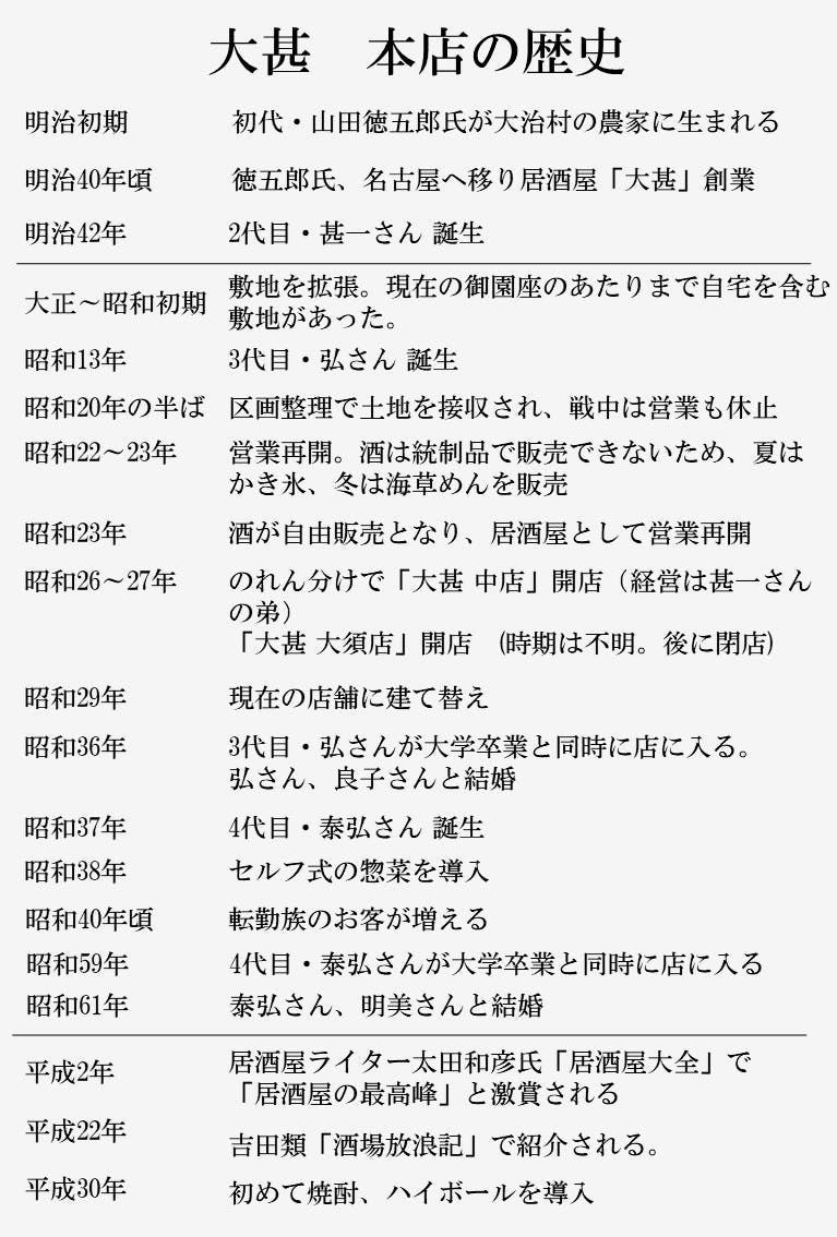 それらがあるからこそ、ありがたいことに「大甚本店」は、入れ替わりの激しい名古屋市内の居酒屋業界において、「創業100年以上」という奇跡を実現できているのかもしれません。
