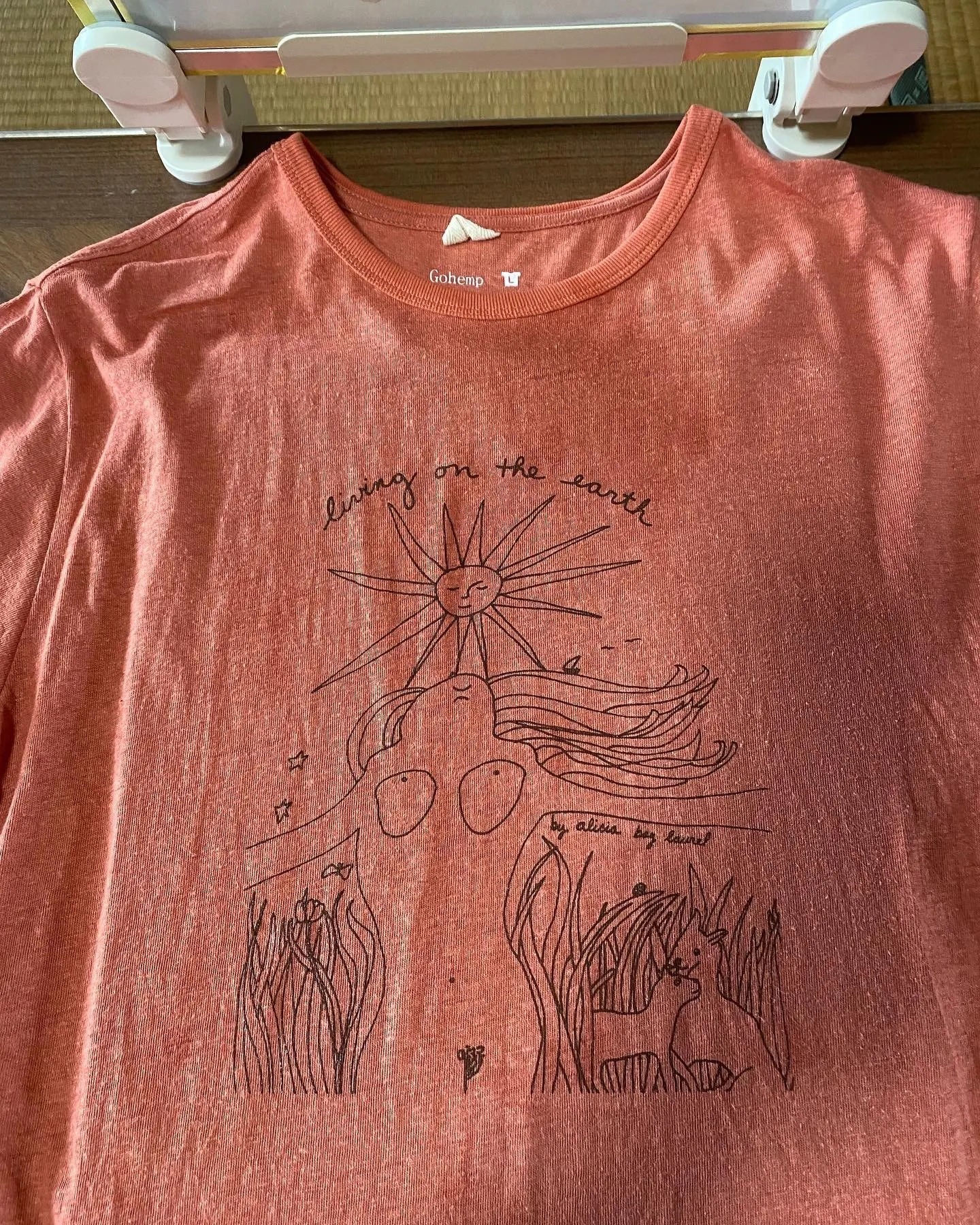 これには、地球環境に負荷のないベンガラ染めを採用し、ボディにはGOHEMPさんのオーガニックヘンプコットンTシャツを使用させて頂いています。