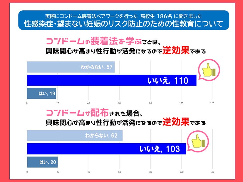 コンドームは性感染症予防や避妊に有効なアイテムです。それでも、まだまだ教育の現場では性にまつわる情報がタブー視され、生徒たちにも先生たちにも偏見や先入観があります。しかし、皆さんもご存じの通り、コンドームは単なるゴム製品であり、マスクと同じ衛生用品です。正しい情報を伝え、使い方を学習すれば、生徒たちは自分の身体への関心を深めながら様々なシュミレーションをしてくれます。