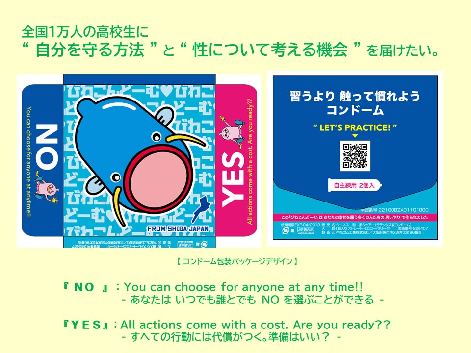 今回制作する「びわこんどーむ」の生徒配布パッケージにはコンドームが2個入っています。ひとつは自主練用です。本番からいきなり使うのではなくて、まずは自分の手で触って、どんな物なのか知ってほしいという思いからきています。男子が本番を想定して自主練するのはもちろんですが、女子でも自分の指にかぶせてみたり、ペアでお互いの指にかぶせてみたり、 伸ばしてみたり、ふくらましてみたり、破ってみたりして、まずは構造を理解して欲しいと思います。「習うより、触って慣れよう、コンドーム」です。