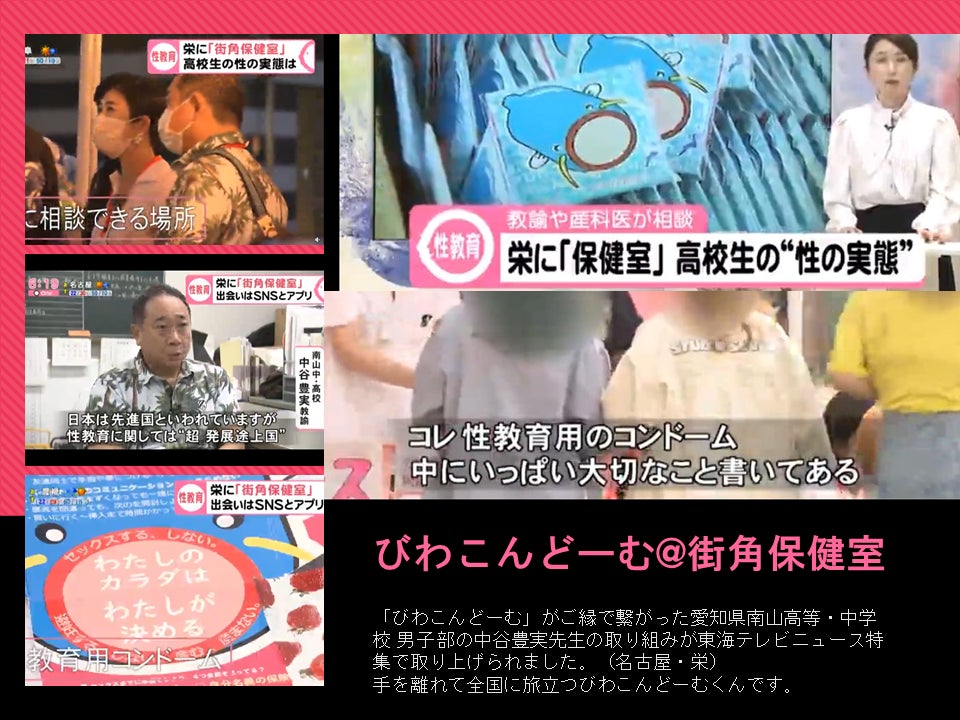 名古屋・栄でピンクの『街角保健室』を主催されている大ベテランの中谷 豊実先生(南山学園中学高校男子部・保健体育科教諭)の取り組みがTV放映されました。学校内外で多岐に渡る活動をされている中谷先生は、Zoom開催した『びわこんどーむ質問会』で出会いました。