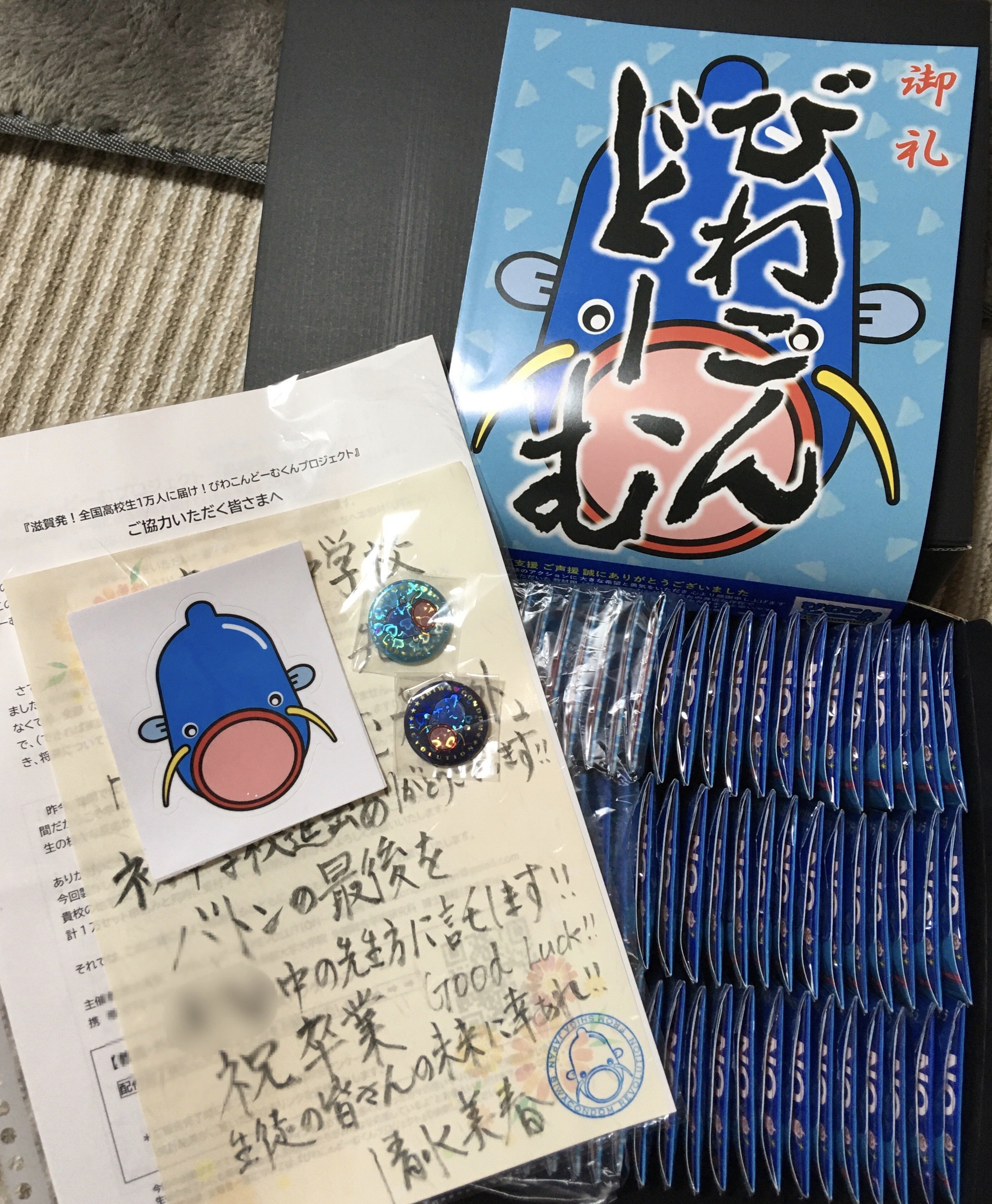 養護の先生が講習を行い「びわこんどーむ」を贈ってくれます。