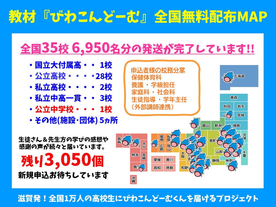 ・実際に手にすることで性について真剣に考えた様子でした。性感染症、出産、中絶、デートDV、LGBTなど自分にとって身近な内容に関心を持ったようで、更に知識を深めたいという内容の感想が多くあり、引き続き学習の場が必要と感じています。配付するタイミングを講師さんと相談して実施することができました。(滋賀・教員)