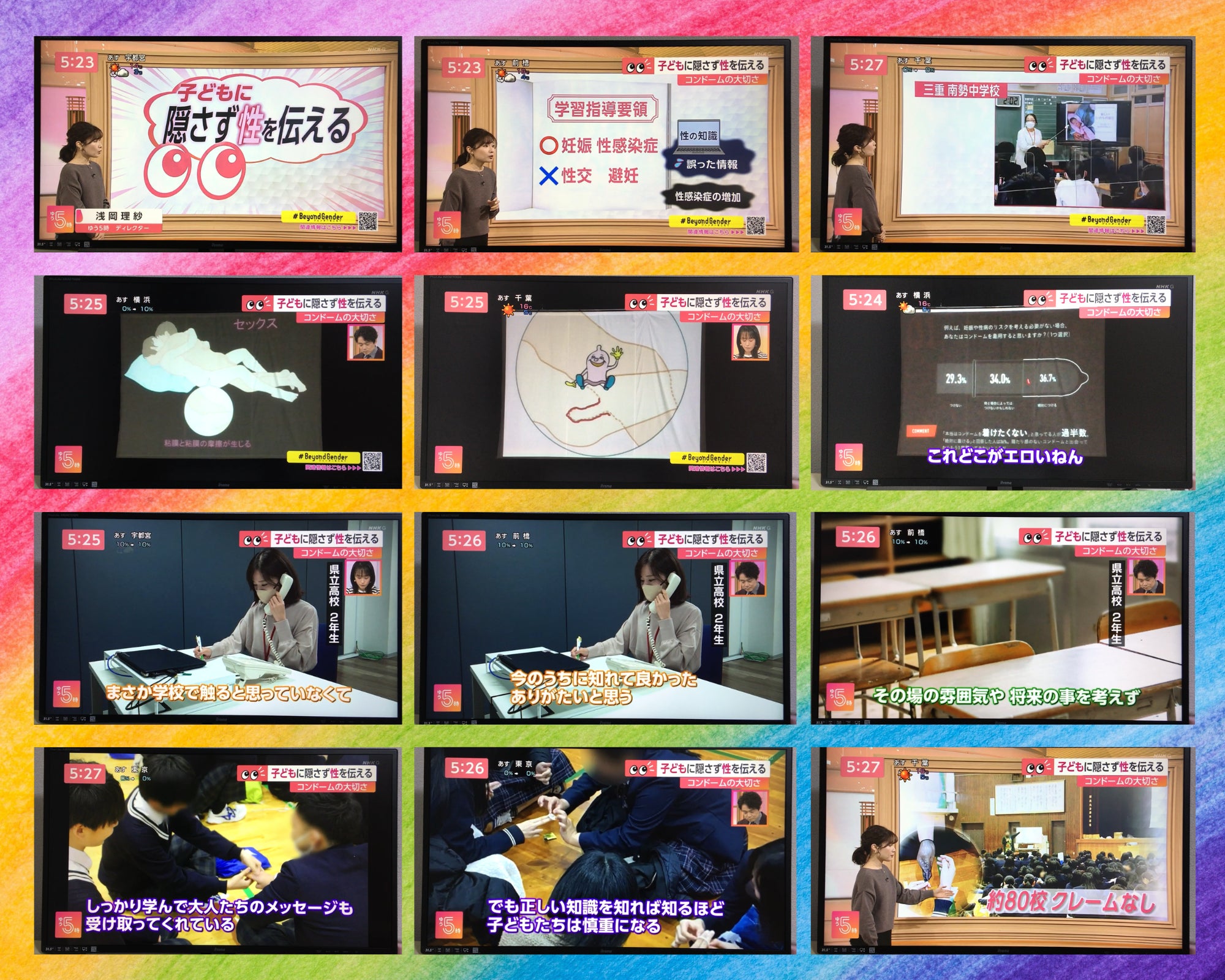 「局内外の反響も大きく、視聴者からは「熱が伝わった。なぜ今まで恥ずかしいと思っていたのか、これが不思議な事だと気づいた」、「学校でやってくれて安心と一瞬思いましたが、そうではなく、これを親とも友達とも語れる事が大切」といった感想が寄せられたとお聞きしています。時間尺の関係で割愛した、びわこんどーむや性的自己決定に関するメッセージはこの後のウェブ記事でたっぷり書かせていただきます!」とのことです。お楽しみに!