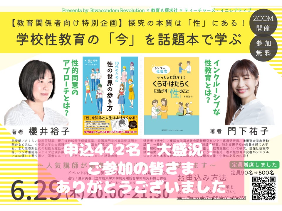 登壇者の櫻井裕子さん、門下祐子さんの著書解説やその後の質疑応答では「対話」という共通ワードが何度も登場しました。「対話」といえば新学習指導要領においても同様に全校種・全教科を横断した「主体的・対話的で深い学び」の実現が記されています。今回のイベントを通じて、それらが実現された学校教育の先にある「性的主体」「性的同意」「自他理解」「対話的コミュニケーション」など、性教育(セクシュアリティ教育)の本来のあり方を垣間見た気がしました。