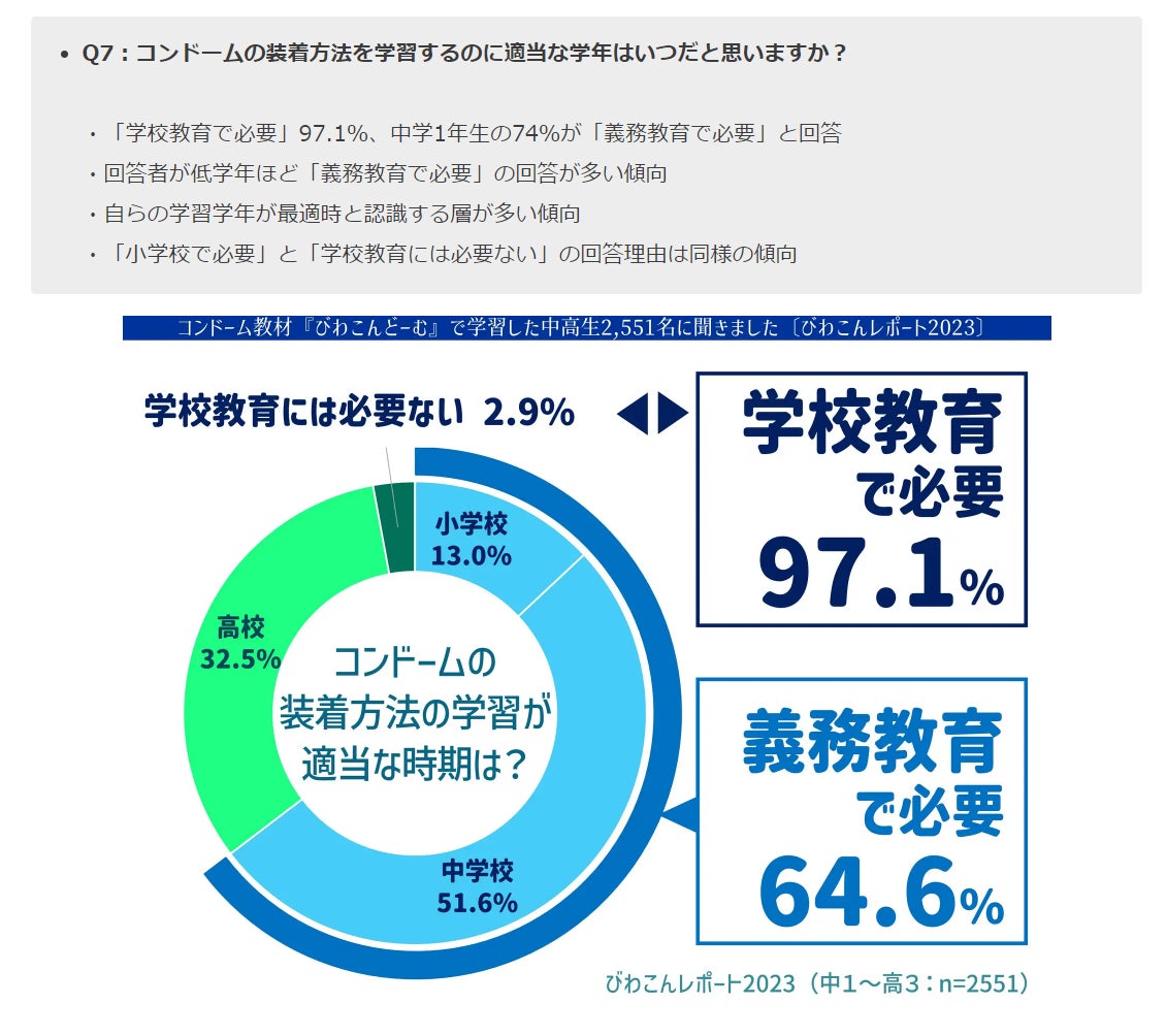 タイトル:性教育の新時代到来!? コンドームに触って慣れる性教育が大好評!! 中高生97.1%が「学校で必要な学習」と回答。最も印象に残った学習内容は「性的同意」。