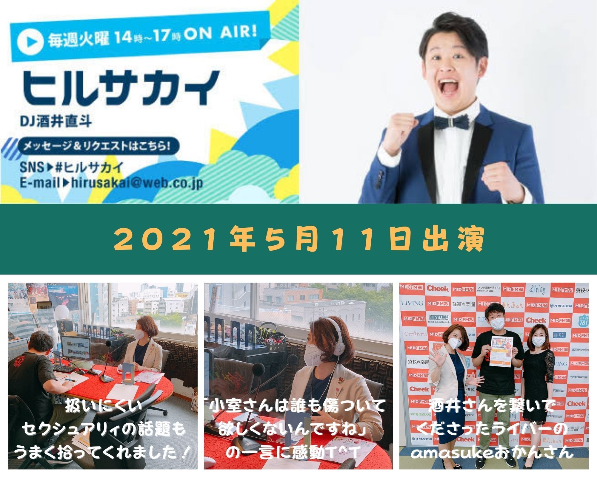 5月11日生放送「ヒルサカイ」(MID FM)にゲスト出演してきました。DJは『大須生まれ、大須育ち、名古屋で活動するピン芸人』というフレーズで紹介されることが多い酒井直斗さん。酒井さんのお名前は昨年出演したCBCラジオでも伺っていて、(「つボイノリオの聞けば聞くほど」にゲスト出演しました。ツぼいさんのエロはセクハラじゃないw)いつかご一緒できたら嬉しいな…と思っていたところのまさかのご縁(*≧∀≦*)!!!願えば叶うものなのですね〜。(そのための努力は要るけどね)普段セクシュアリティと接することのない人はDJであってもやっぱり難しいジャンルだと思う。酒井さんはそれを上手に掬いあげてくださって「小室さんは誰も傷ついて欲しくないんですね」とまとめてくださり…ああそうか〜。私は誰にも傷ついて欲しくないんだなと改めて実感しました。自分の意見や考えをアウトプットして誰かにまとめてもらうこと。思いが強ければ強いほど一方的な偏りが出てしまう発信者にはとても大事なことですね。ゲスト出演時の動画配信中✩ ⋆ ✩ ⋆ ✩ ⋆ ✩ ⋆ ✩ ⋆ ✩ ⋆ ✩https://youtu.be/nwmajwyfj1Q✩ ⋆ ✩ ⋆ ✩ ⋆ ✩ ⋆ ✩ ⋆ ✩ ⋆ ✩