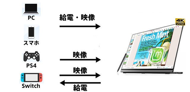 PCとLUNEはUSB-TypeCおよびHDMIで接続可能です。USB-TypeCを使った場合はPC側からLUMEへ給電とデータ送信ができます。また、LUNE側で65W以上のアダプタで給電している場合は、PC側へ電力を供給できます。
