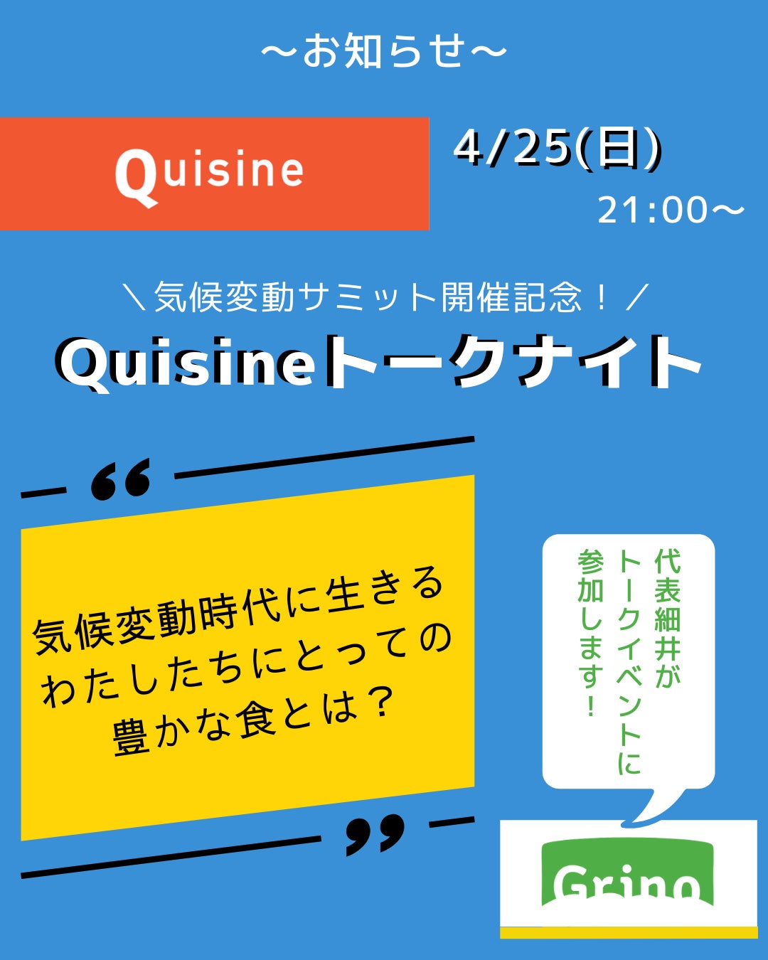気候変動サミット開催記念! Quisine トークナイト