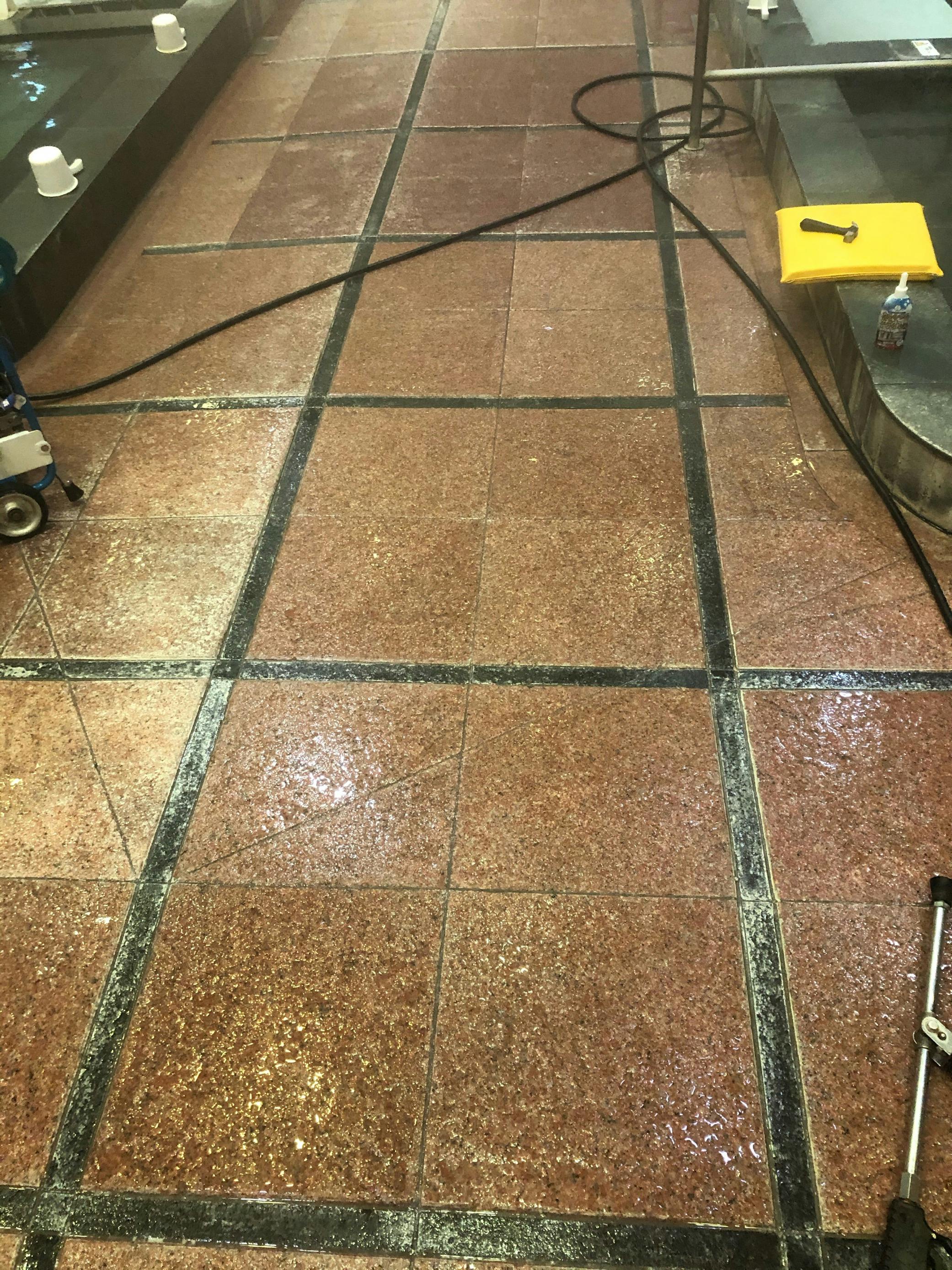 ←浴場床面の高圧洗浄