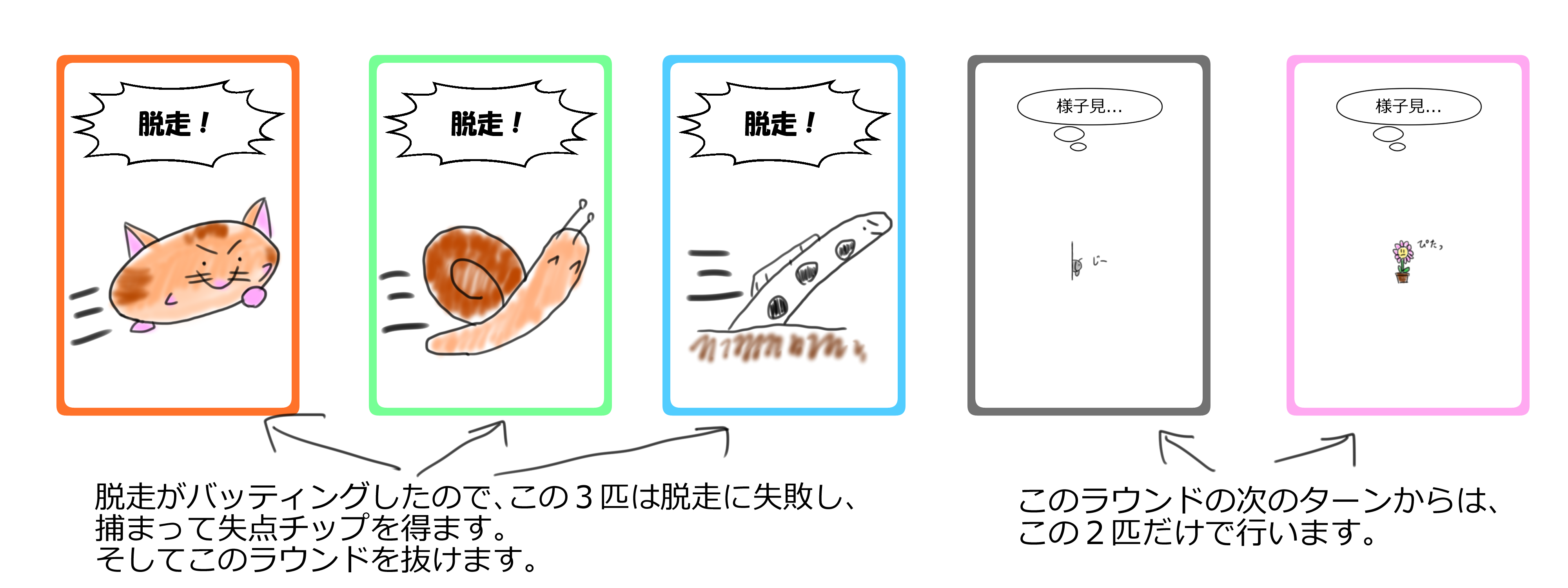・「脱走」と一緒に「フェイント」が出されていた場合、「脱走」を試みたプレイヤーは脱走に失敗してしまいます。この場合、「脱走」を出したプレイヤーが捕まり、ラウンドが終了します。