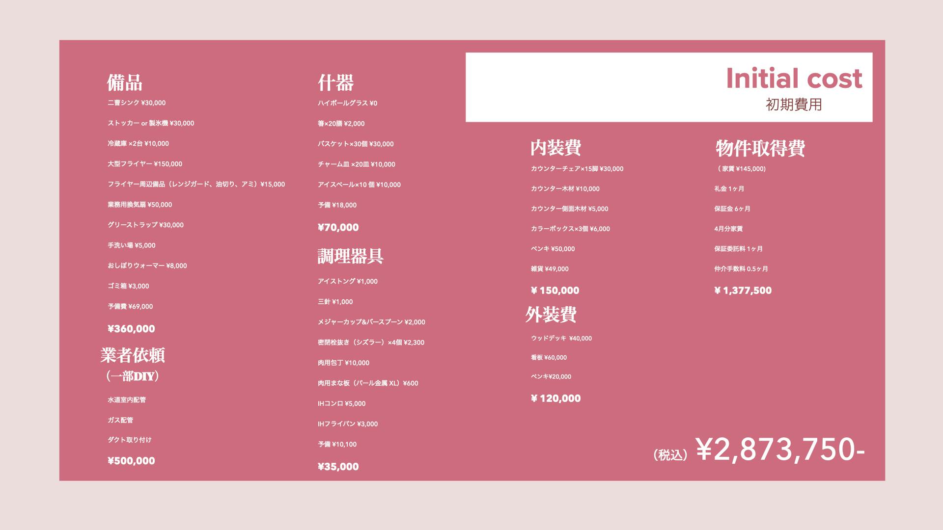 飲食店の開業をご経験された方ならほぼスケルトンみたいな物件一つと、もう一店舗の改装、そして物件取得費を入れてこの値段は目ん玉飛び出るかもしれません。