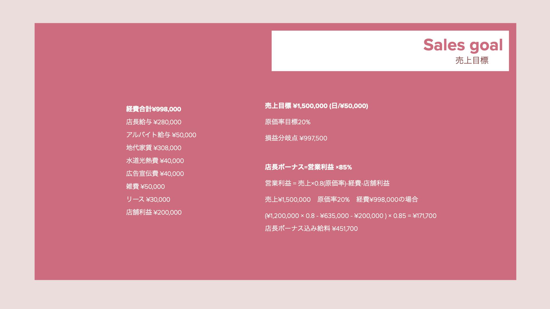 今回は、今のゆとり会議室の経費から諸々想定して大体の予想経費を出しています。なので荒唐無稽な数字というわけではありませんが、飲食店はやってみないとわからないことも多いので一つの指標であり、目標となります。