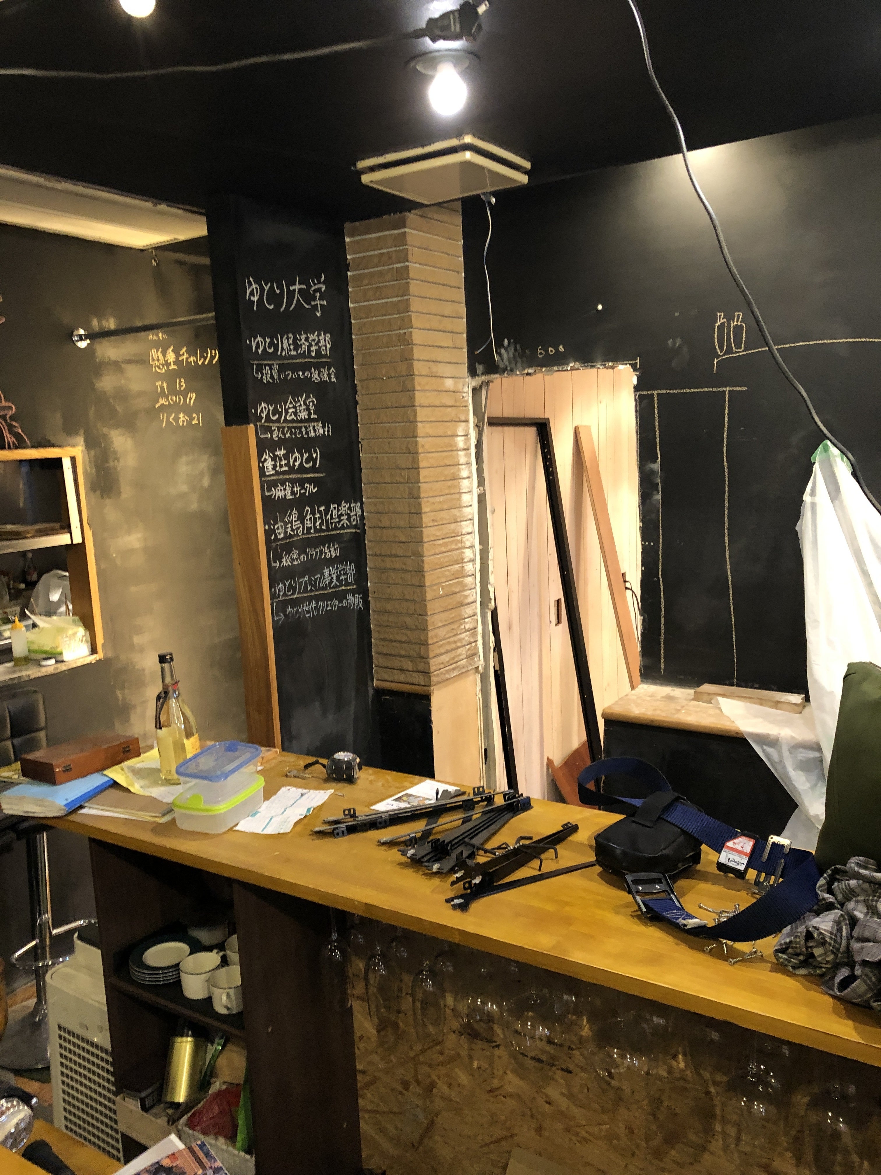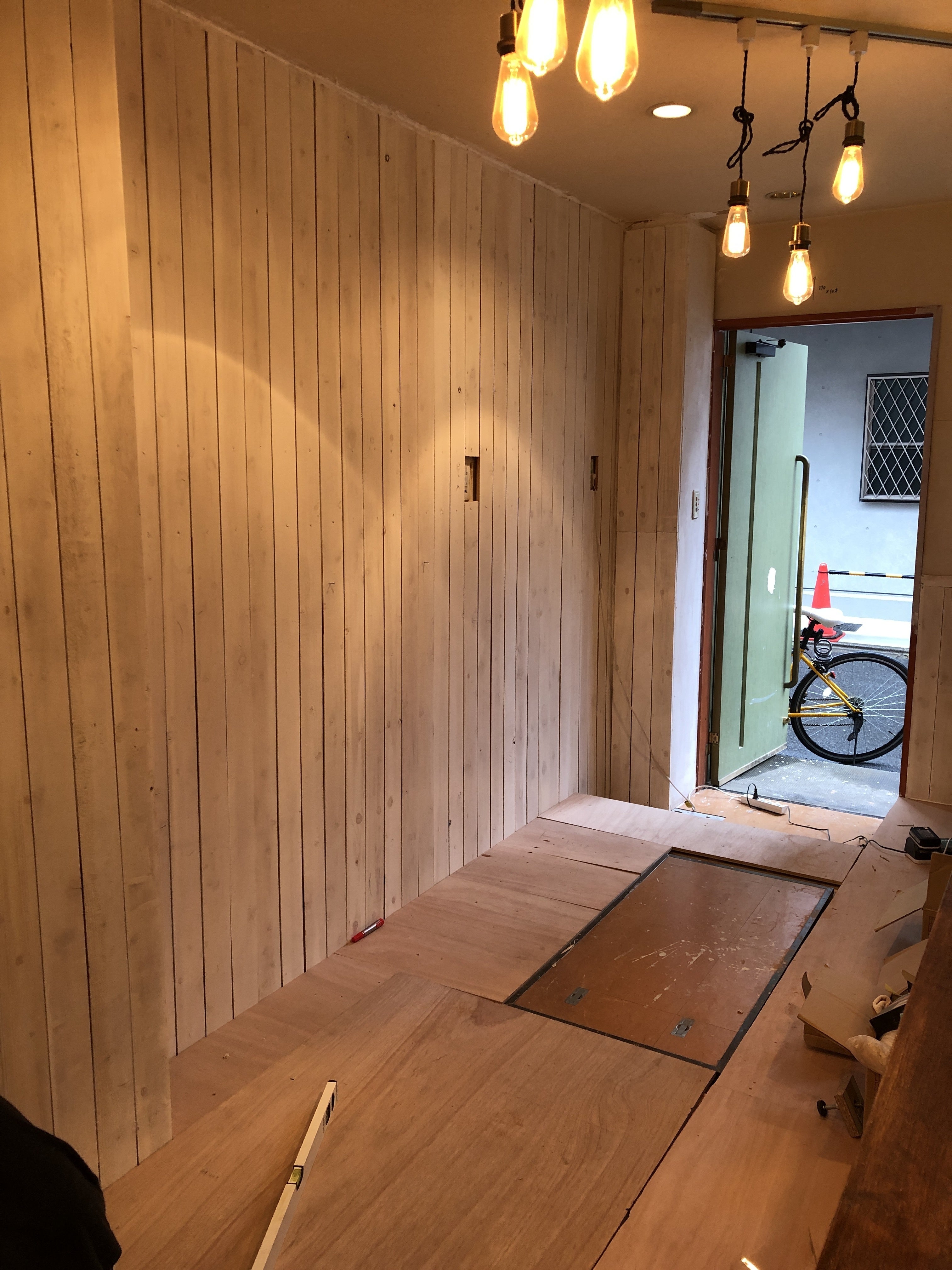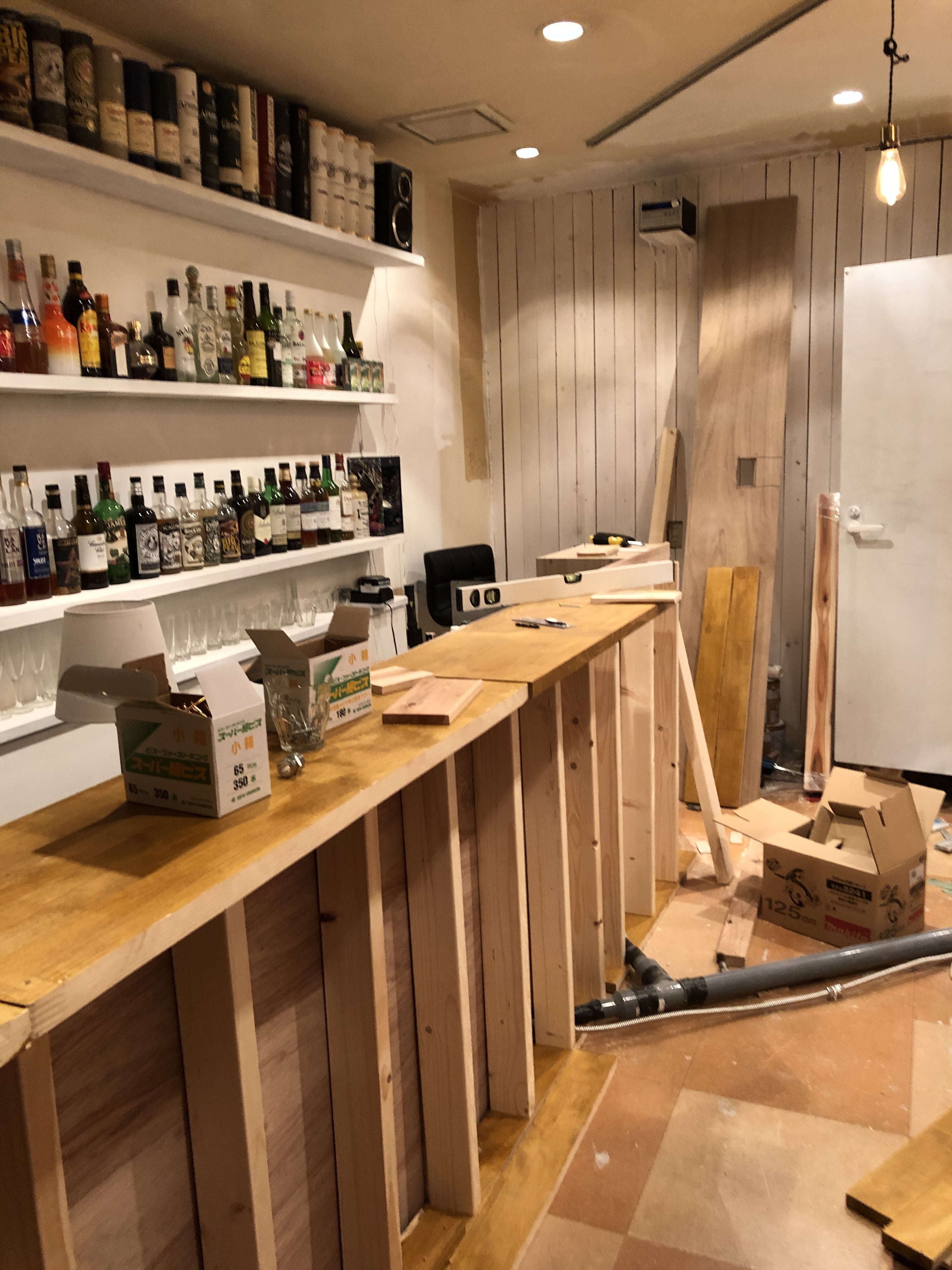 ボトルの背中の壁紙とか、酒棚のライトの色味とか、そもそも床もあげてないし、油鶏角打倶楽部との扉とつけてないし、カウンターも不安定で軋んだらするし、、、