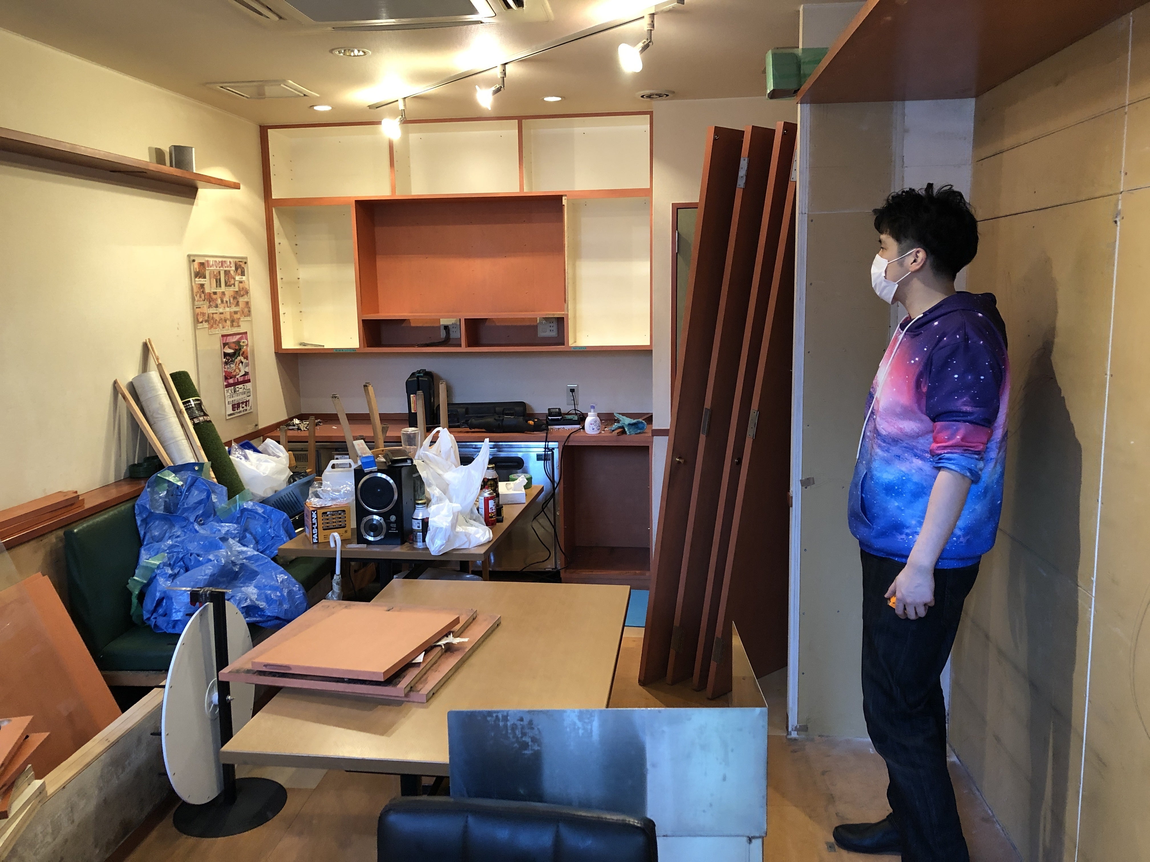 お店やん!!!!という皆さんの絶叫がスマホを通して私の方までビンビンに届いております。ソーシャルディスタンスでお願いいたします。一週間でここまでいくかー!と自分でも驚いております。解体を9割終え、壁や天井をひたすら白く塗ります。ボランティアとして僕の京都時代のお客様も駆けつけてくれました!!「塗るのが下手すぎて皮膚病の犬みたいやん!!」と言われてる一枚。全部がうまくいくわけもなくて、でもそんな不器用だけど人の手の温もりを感じる、それがDIYの醍醐味ですし、くつろげる空間造りの一つかなと思います。壁を塗ると一気に良い感じに見えてくるのが不思議!!正直解体してる時は「これどうなんの??」と自分のことながら呆然としていました。呆然としながら壁叩き壊してました。一番怖い人です。爆裂剥がれた天井の壁紙。どういう風にこれを隠すのか、是非お店が完成した時は見にきてください。今のところ解決策は見えておりません。豊洲から朝一で仕入れたピチピチのカウンターを直送中。4メートルの木材をトラックで運ぶのってめっちゃ怖いらしいです(←免許持ってない)カウンターと酒棚の板が手に入ればひたすらヤスリです。1時間くらい無心でヤスリます。そしたらニス塗りですね〜ニス塗り、ヤスリ、ニス塗り、ヤスリ。この破壊と創造をひたすら繰り返し鏡面のような美しいカウンターに仕上げていきます。二度塗り、二度ヤスリを終えた段階で本日は終了!!いや〜〜〜なかなかお店っぽい雰囲気が出てきたのではないでしょうか!!現在の内装工事進捗はこんな感じ解体色ぬり取り付け ←イマココ床あげですがまだ 天井、壁塗り が残っているのです!!もしやってみたい方、スプラトゥーンが得意な方、おられましたらお手伝いお願いいたします!飲食店のできるところに携わることなど今後一生ないかもしれませんよ〜なくても困りませんが〜お店ができた時に「この天井は自分が塗ったんやでー!」と周囲に言いたい気持ちを肴にお酒が飲めます。20日に完成させれるよう、明日からも頑張っていきますのでもし気になったらお声掛けくださいませ!工事現場見学させていただきます!笑そして最後にはこんなのにしたい・・・