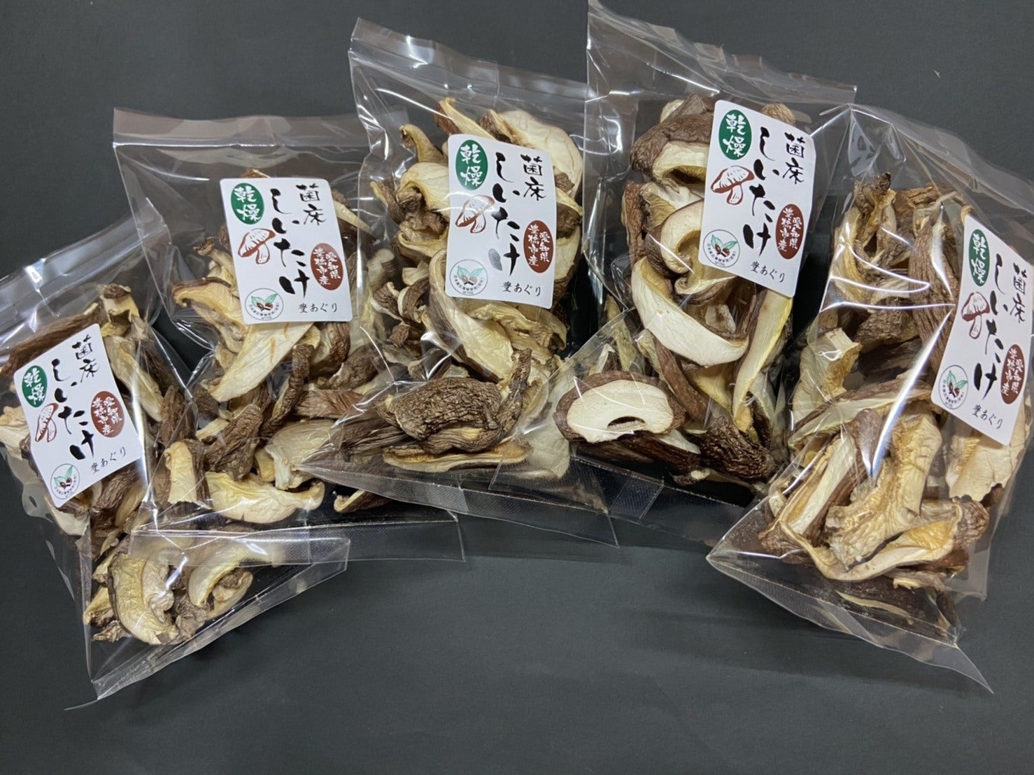 軸を切り落とし1センチ幅でカットした椎茸を乾燥させ、20gづつに小分けしました。