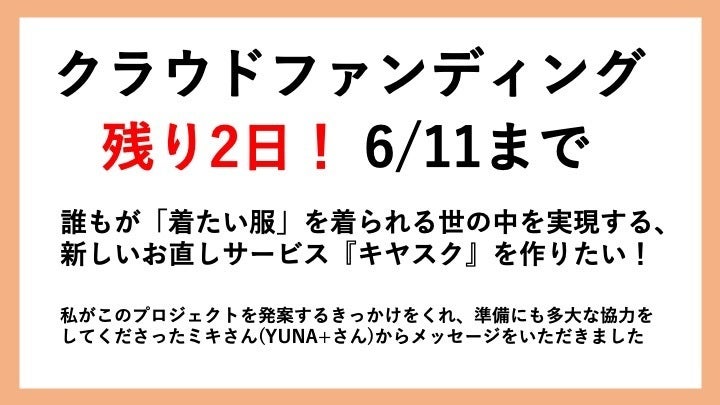 クラウドファンディングの本文の中にも登場しますが、『キヤスク』の構想に私がたどり着くきっかけをくれ、クラウドファンディングの準備でも多大なご協力をいただき、さらに募集開始直後から今に至るまでずっと、自分ごととして私と一緒に伴走してくださっているミキさん(YUNA+さん)から、メッセージをいただきましたので紹介させてください。