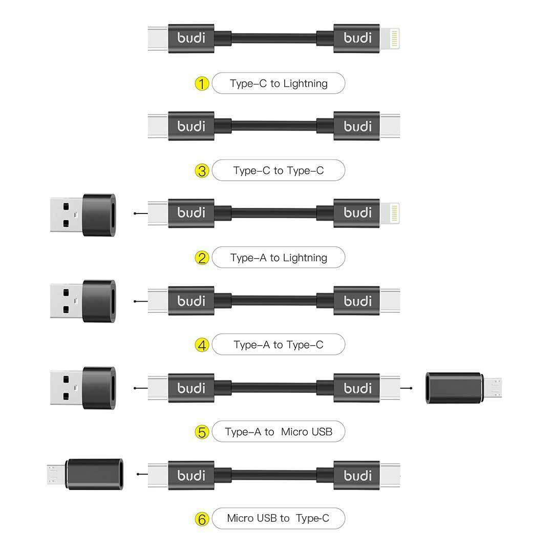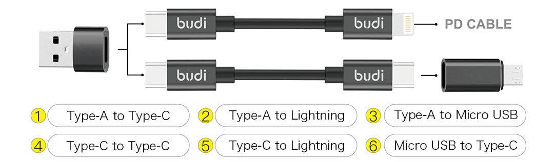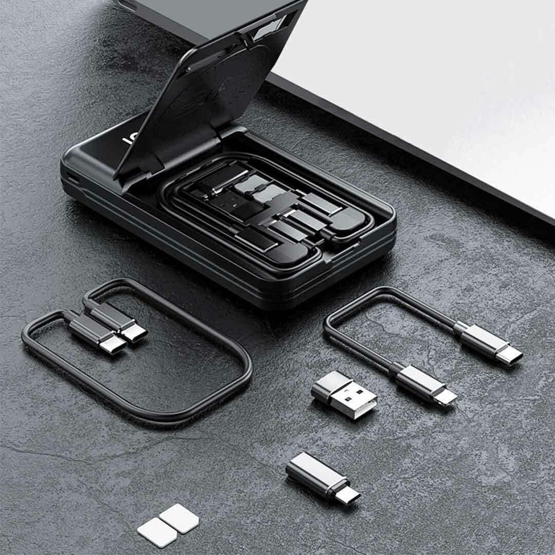 本体に収納されている2本の付属ケーブル(USB Type-C to C 29cm)&(USB Type-C to Lightning 16cm)と変換アダプター(USB Type-A、micro USB)で6種類の接続端子に対応。