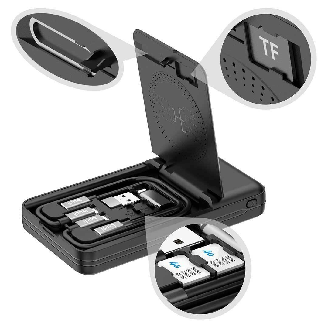 スマホやデジカメで撮った写真や動画、ダウンロードした音楽などの保存に一番使われている「microSDカード(=TFカード)」1枚と、スマホのSIMカードでも使われている「nanoSIMカード」2枚、そしてSIMカードの交換は勿論、ルーター、デジタル時計などのリセット、メディアドライブの取り出しでも使える「SIMピン」をボックス本体に収納!