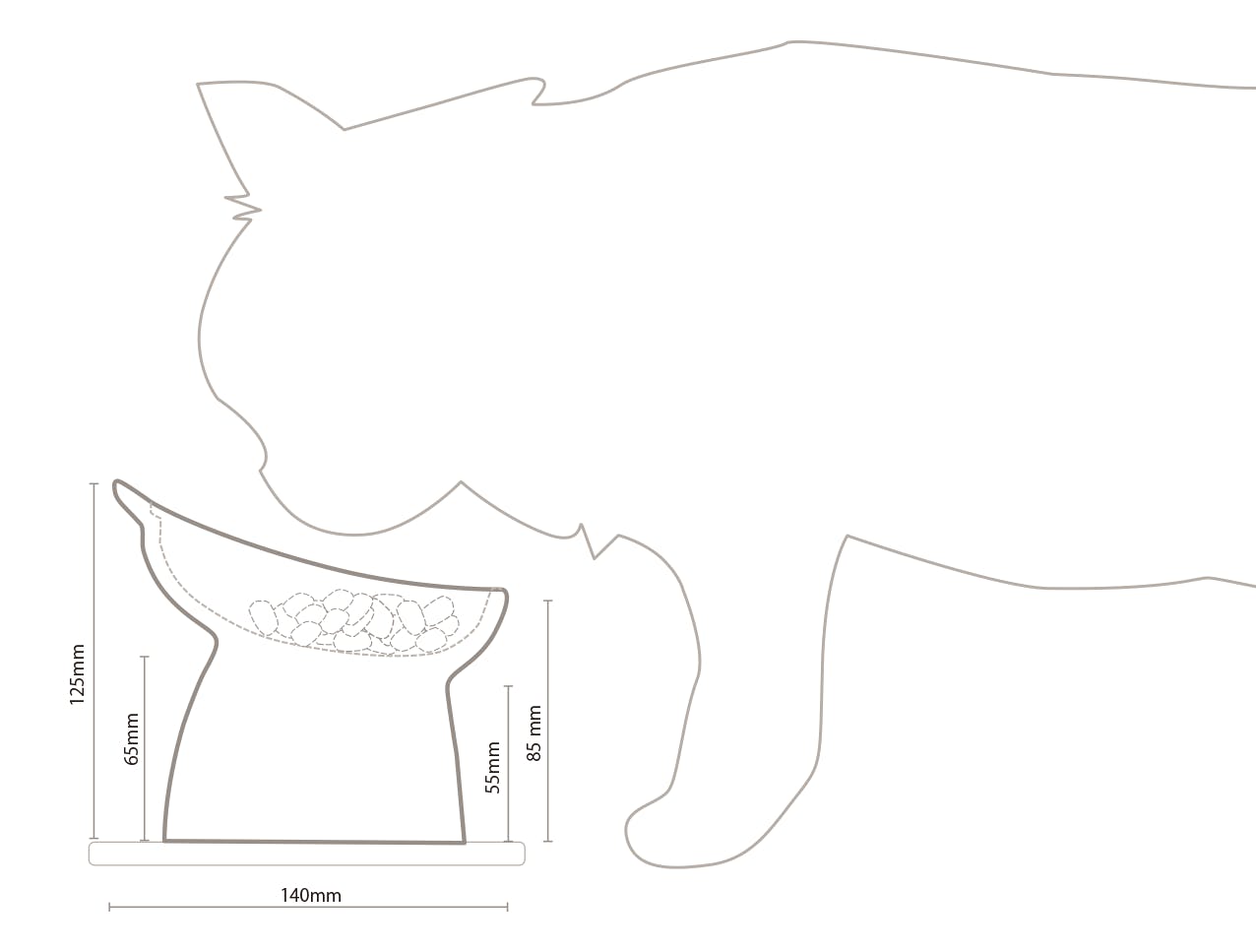 パウ・ボウル ONIGIRI(おにぎり)の台座の部分は猫の体高に配慮した高さになっており、上から見ると角丸三角形。横から見ると、その三角形の頂点に向かって傾斜がついています。この傾斜は、カリカリが滑る角度となっており、フードが偏らないようにするためと、食べる時の猫の首の傾斜による吐き戻しや頸部への負担にも配慮したものです。