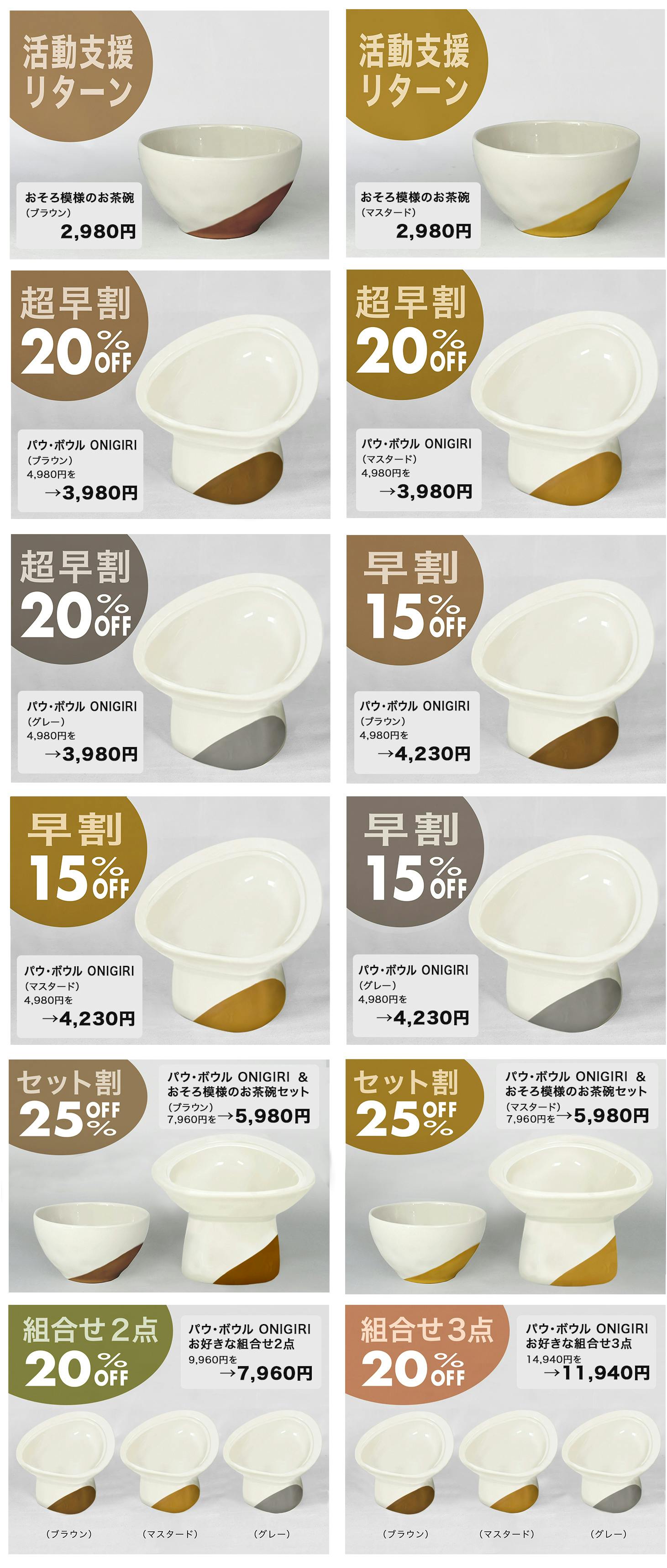 また、本プロジェクトのリターン品として、パウ・ボウル ONIGIRI に加え、おそろい模様の「お茶碗」(カラー:ブラウンorマスタード)もご用意しています。フード・ボウルの買い替え予定はないけれど、猫は飼っていないけれど、本プロジェクトや活動に共感いただき、ご支援いただける方も大歓迎です。