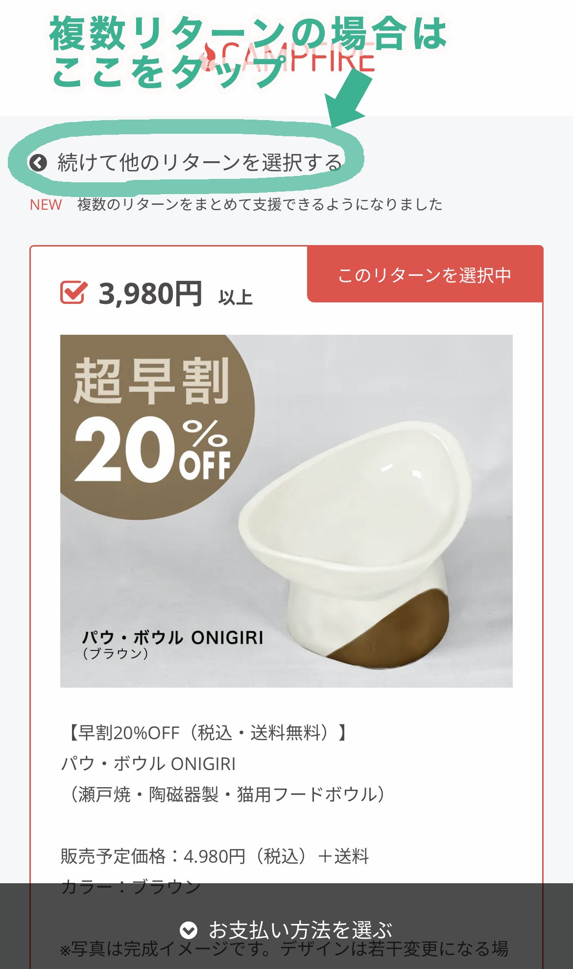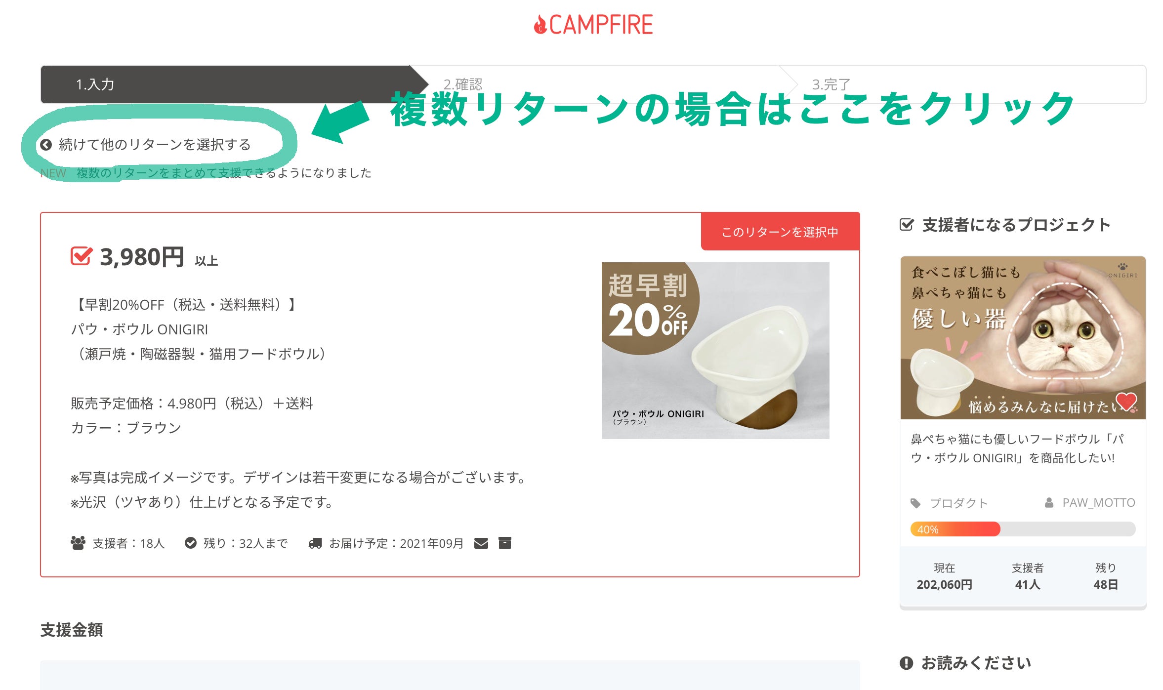 個別のリターン詳細画面から「複数リターンを選択する方法が分かりづらい」とのご意見がありましたので、補足いたします。