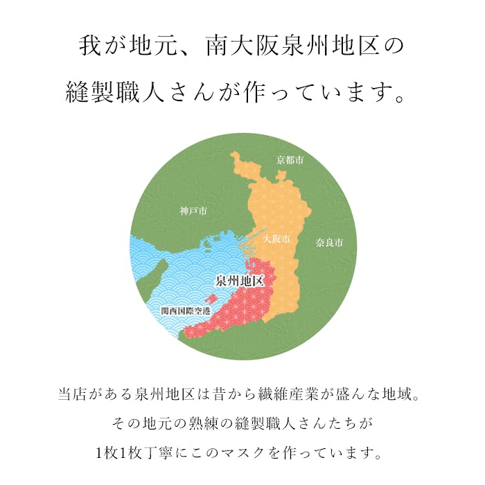 泉州の職人が作った布マスクを広めたい!日本製にこだわり、裏地にガーゼやさらしを使った着心地良く、なおかつオシャレなマスクを広く皆様に使ってもらいたいと思っております。