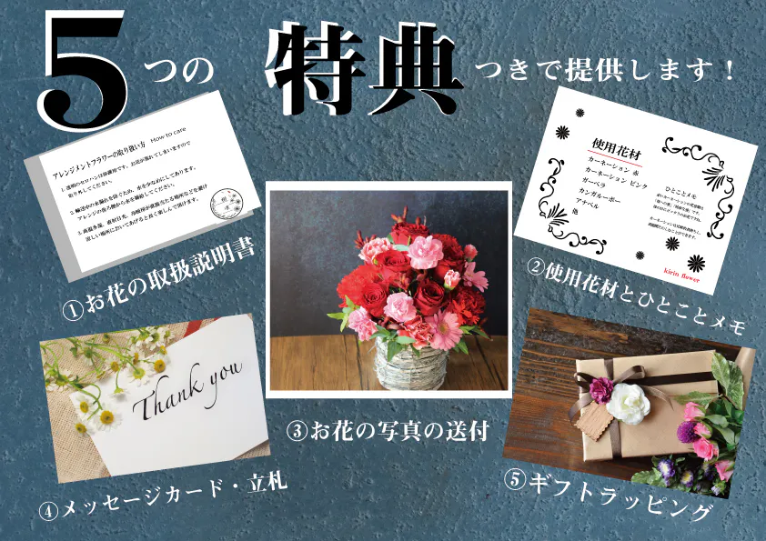 結婚祝い、お誕生日、卒業祝い、舞台のお祝い、プロポーズ、開店祝い、昇進祝い、退職祝い、そしてお葬式、命日のお供え。
