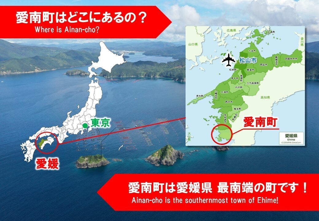 愛媛県の最南端、南予(なんよ)地方に位置し、人口はおよそ2万4千人、水産業が盛んであり、愛媛県内唯一のカツオの水揚げ基地(深浦港)があります。南国情緒あふれる愛南町は海や山の自然に恵まれ、豊かな資源をもつ地域です。