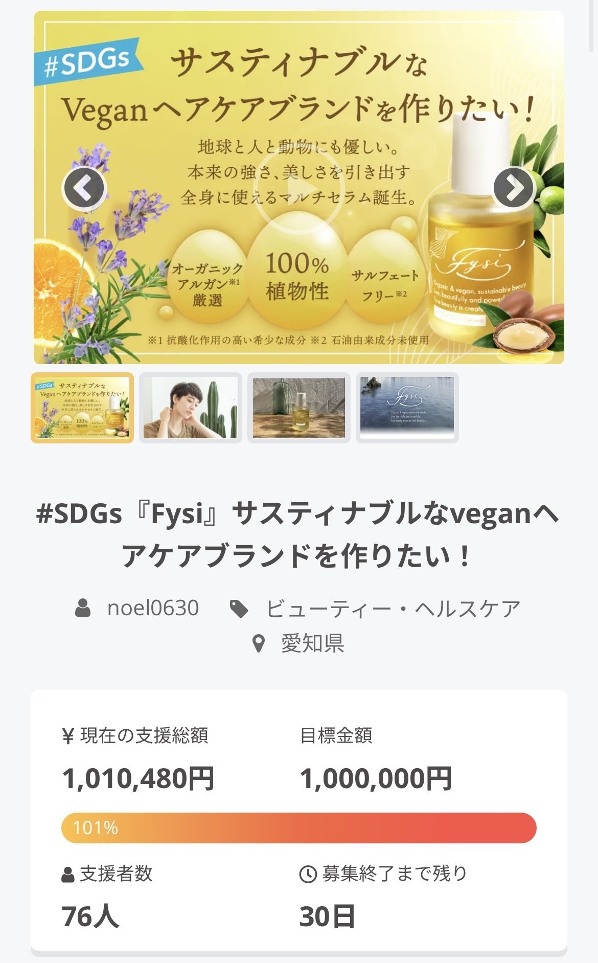 Fysiクラウドファンディングページをご覧頂き誠にありがとうございます!当クラウドファンディングでは動物や環境に配慮したオリジナルヘア&スキンケアブランドFysiのマルチセラム製作を目指しており、8/30を持って既に第一目標の100万円を達成しております。Fysi製作の夢を叶えられる事、これまで支えて下さった沢山のサポーターの方々に本当に本当に感謝しかありません。これからFysiができる限り多くの方の目に留まり、Fysiを通じて環境問題や世界の貧困問題などの社会問題が他人事では無いのだと、助け合って生きていかねばいけないのだと、意識を切り替えて頂ける小さなきっかけになれば本当に嬉しいです。私達のクラウドファンディングも残すところあと3日で終了となります。ネクストゴール300万円までは程遠いですが、私は諦めていません。最後まで告知活動を行い、少しでも未来に向けて歩みを進めていきたいと思っています。自分みたいな小さな個人でも少しづつ未来は変えられる。私はそう信じています。どうか皆様のお力を貸して下さい、引き続き応援の程よろしくお願い致します!Fysi 主催 前田 ユーキ