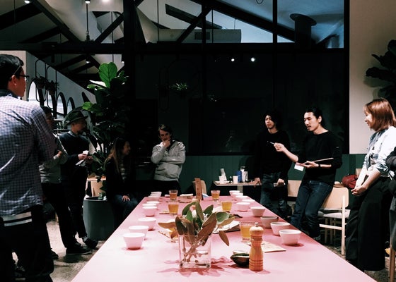 ミネ焙煎のAu79コーヒーを、ローカルバリスタ達が集まってカッピングしてくれました。 今回のポイントはコーヒー豆毎に、 「水道水」「ピュアウォーター」(市販)「カスタムウォーター」(ピュアウォーターにMgやCa, Bi-Carbを添加) の3種類の水を使用する点です。コーヒーと水の組み合わせから、感じ方の違いを探ります。 結果は意外にも◎「水道水」×「ピュアウォーター」でした。 (ミネの解説)数値をみても「水道水」が一番く成分が抽出されています。これは、ピュアウォーターと違い水道水に含まれる不純物が良い方向に影響しているからと考えます。感覚的にいうと、水の中に隙間があってコーヒーが良く撹拌(かくはん)されている様なイメージです。逆にピュアウォーターは隙間なく詰まっていて、フレーバーが生きていないと感じました。 今回のカッピングについての内容は、Mine Coffee ニュースレターでまたあらためて配信いたします。 仕事の後もこうして夜な夜な集まり高め合うバリスタ達の姿、格好良かったです。