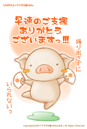 2017/08/29 00:19おはようございます。こんにちは。こんばんは。 長野県在住のイラストレーター、ラクガキ屋Mallu(まる)です。 プロジェクトのご支援ありがとうございます♪ 今日(8/29)時点で6名の方にご支援を頂きました。 支援して戴いた皆様のお名前(ユーザー名)入りの画像をアップさせて頂きます。 ※掲載はご了承頂いた方のみです。 『masahiro1121』さま。 『duxgia』さま。 『soramame3』さま。 『masahiko_naka』さま。 『naomi toda』さま。 画像はご支援頂いた順番で上げさせて頂きました。 皆様、ありがとうございました。 もっと見る