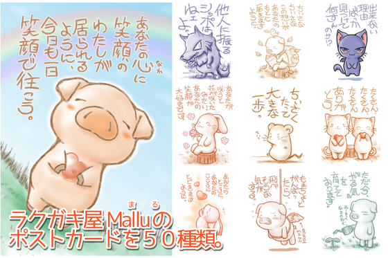 ちなみに、ラクガキ屋の「ラクガキ」はブタさんが一番多いです。ブタさんは「作者の分身」と言う設定で描いています。