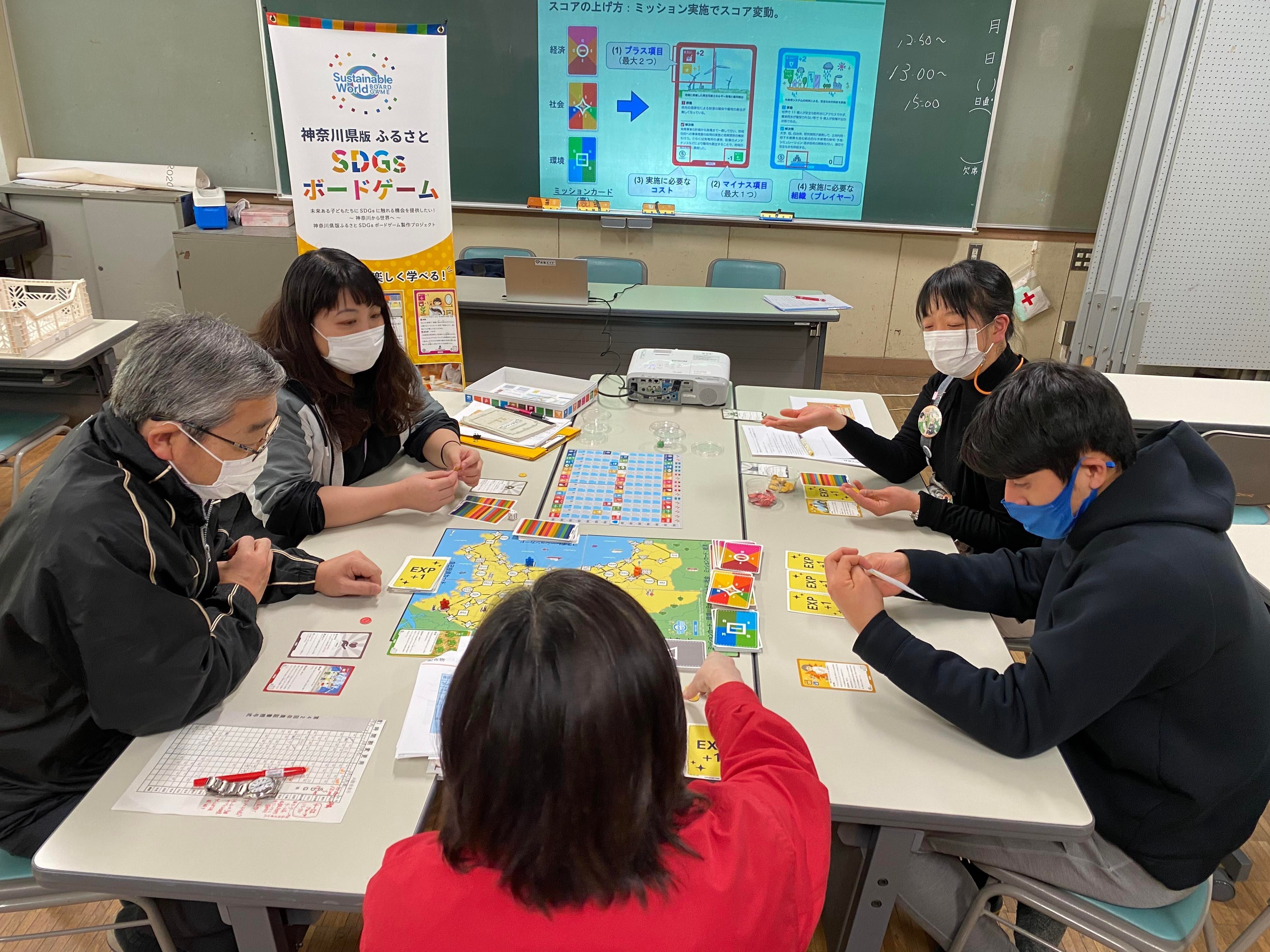 こんにちは。私たちの取り組み『未来ある子どもたちにSDGsに触れる機会を提供したい!~神奈川から世界へ~』に多くの方々にご支援いただきましてありがとうございます。今日は、横浜・八景島シーパラダイスのある神奈川県横浜市金沢区にある西柴中学校2年生3クラスで、「SDGsをジブンゴト化するワークショップ~神奈川県版」を実施してきました。 ー--【学校実施事前オリエンテーション】西柴中学校様はこちらー--https://camp-fire.jp/projects/412405/activities/356021#mainー--------------------------------プログラムでは、思い込みや先入観を捨てて自ら調べ、深く広く捉えるためのクイズからスタートするのですが、そのクイズへの熱中度からして違いました。どの生徒さんも、姿勢よく、話をしている私たちや発表者の方を向き、手を挙げるときはしっかりと手を挙げる。とてもしっかりしている印象を受けながら、プログラムをスタートしました。生徒さんのSDGsの認知度もほぼ100%(ちなみに日本全体では50%前後とされてます)。そして、ただ単にSDGsって言葉を聞いたことがあるだけでなく、「2030年までに全世界の人たちで取り組むことを誓った17の持続可能な開発目標」と説明してくれました。そんな彼らが、神奈川県内のSDGs取り組み事例が100枚以上収録された「SDGsボードゲーム」を使って、いかに世界を良くするか(17のゴールをすべて最大化する)、また、参加しているプレーヤーも全員自己成長するか、一人ではなく協業して世界はよくなるか、などをテーマに1クラス6グループに分かれて競いあいました。 各グループの名前などを黒板に書くと、ある生徒さんから「各グループが一つ一つ別の地球だね。同じ時間でどんな世界ができるか楽しみ!」という声が出たり、「まず全員で自己成長してスキルを上げてから、みんなで世界を良くしよう。協力も大切だけど、まずは一人一人の力をつけてから!」「いや、それじゃあ、目の前の課題やミッションはどうするの?」なんて声も聞こえてきて、各グループが各々に作戦を考えながら、プレイを進めていきます。なかには、とても芸術的な生徒さんもいて、「コインの並べ方が美しい方が楽しいでしょ!」と言いながらコインタワーを作って、チームの雰囲気を上げている方もいて、一人一人がとてもユニークで、そしてパズルのように組み合わさったグループは、まさに多様性の世界を象徴しているようです。ゲームが一旦終了すると、アンコールが教室中から響き、特別に5分延長戦を行うほどの白熱ぶり。ゲーム終了とともに、「もっとやりたい!」「もっといろいろな事例カードを見たかった!」「あと、1時間あれば、ALL10行けたかも!」なんて声が聞こえてきました。振り返りの時間にもとても興味深い意見や感想が飛び交いました。各グループごとに、成果が発表され、各グループリーダーからは戦略と勝因を語ってくれました。特に印象深かったのが、「うちはとにかくポジティブでした。感染症が起きても、地震が起きても、増税になっても、イベントカード運はなかったのですが、どんなことが起きても、みんなで受け止めてから、『さあ、ここから!』と前向きにやっったのが良かったと思います。何事も前向きでやるのと、そうでないのとでは、心の健康が違うと思います」との発言。また、クラス全員が誰一人取り残さずランクアップを達成したのがこのクラスの特長をとてもあらわしているかもしれません。そして、実施後のアンケートでも、「SDGsなんて自分では全くできないと思っていたけれど、案外できることがあるのではないかと思った」「協力しないと、時間がとてもかかる」という声もあり、とてもしっかりと受け止めてくれたんだなと嬉しくなりました。120分みっちりの授業終了後、帰り際の廊下には、ユニセフのSDGs記事なども貼られており、SDGs認知率100%の意味が分かった気がしました。今回、とても協力的な先生方のおかげもあって、素晴らしい時間を私たちも過ごさせていただけました。西柴中学校の校長先生はじめ教職員、そして生徒の皆様には心から感謝申し上げます。皆様の素晴らしい成長を心からお祈りしてます。また、どこかでお会いできる日を楽しみにしてます。引き続き、どうぞよろしくお願いいたします。一般社団法人未来技術推進協会神奈川県版ふるさとSDGsボードゲーム制作プロジェクト 実行委員会 一同ーーーFacebookページ「未来ある子どもたちにSDGsに触れる機会を提供したい!~ふるさとSDGsボードゲームプロジェクト~」 https://cutt.ly/NbPpzZhーーー<活動報告>・完成報告体験会を開催しました!https://camp-fire.jp/projects/412405/activities/332079#main・神奈川県版SDGsボードゲームを使ったファシリテーター認定講座を行いましたhttps://camp-fire.jp/projects/412405/activities/331708#main・神奈川県版ふるさとSDGsボードゲームワークショップ実施「内定校」決定のお知らせhttps://camp-fire.jp/projects/412405/activities/335488#main