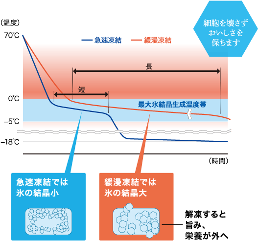 この温度帯を通過する時間が長いと氷の結晶が大きくなり、食品の細胞や繊維を壊してしまいます。