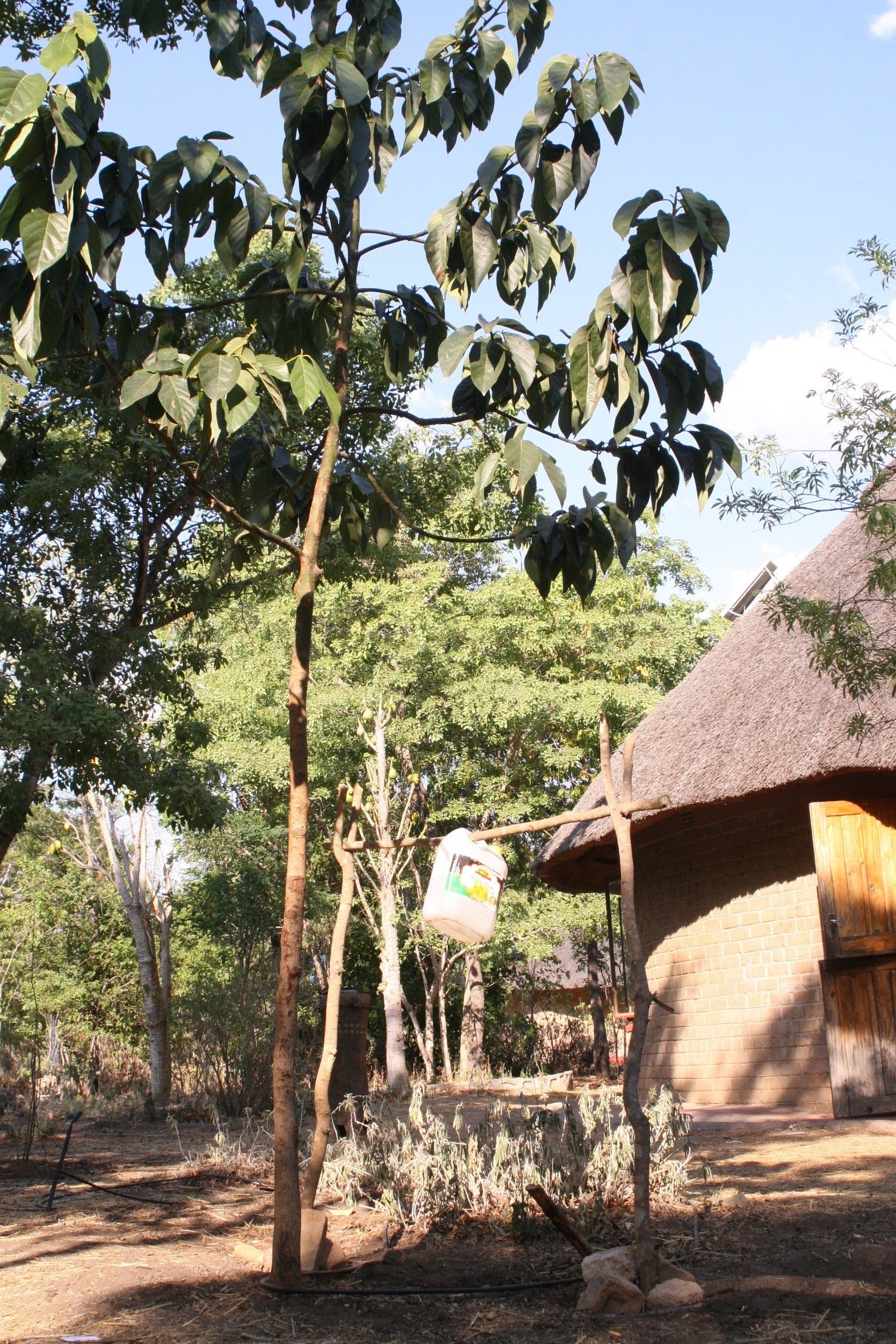 水道のないコミュニティーでは手洗いの習慣がないため、命を守るために手洗いの習慣を伝えます。その際に作った手洗いシステム。どこにでもあるプラスチックボトルで作り、足元の木を踏むと水が出るようになっている。