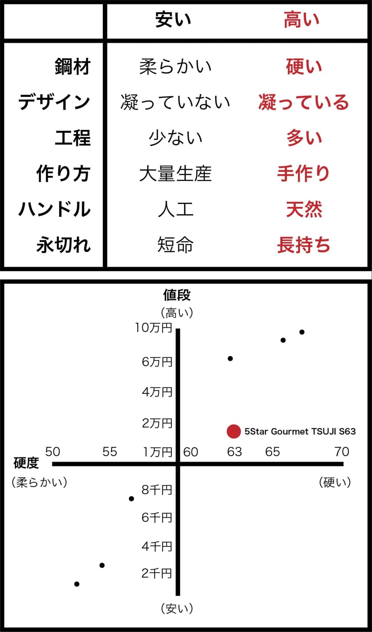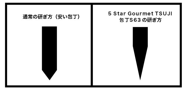 5 Star Gourmet TSUJI 包丁S63は一般的な平均硬度55〜60よりも非常に硬い硬度63を採用しています。