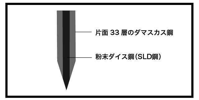 5Star Gourmet TSUJI S63包丁は、硬度63ある粉末ダイス鋼は、同じ硬度の包丁相場に比べると半分くらいの値段でリーズナブルです。超硬度で高級鋼材の粉末ハイス鋼と同等レベル以上ある粉末ダイス鋼SLDを芯材として、片面33層のダマスカス鋼で挟んで作られています。