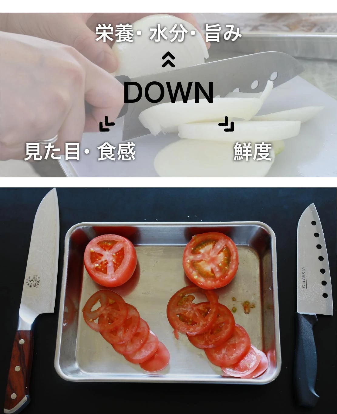 切れない包丁は食材を押つぶすように切っていくので、繊維や細胞がつぶれ旨味も逃げて、栄養、水分も抜けて鮮度や食感も悪くなってしまいます。