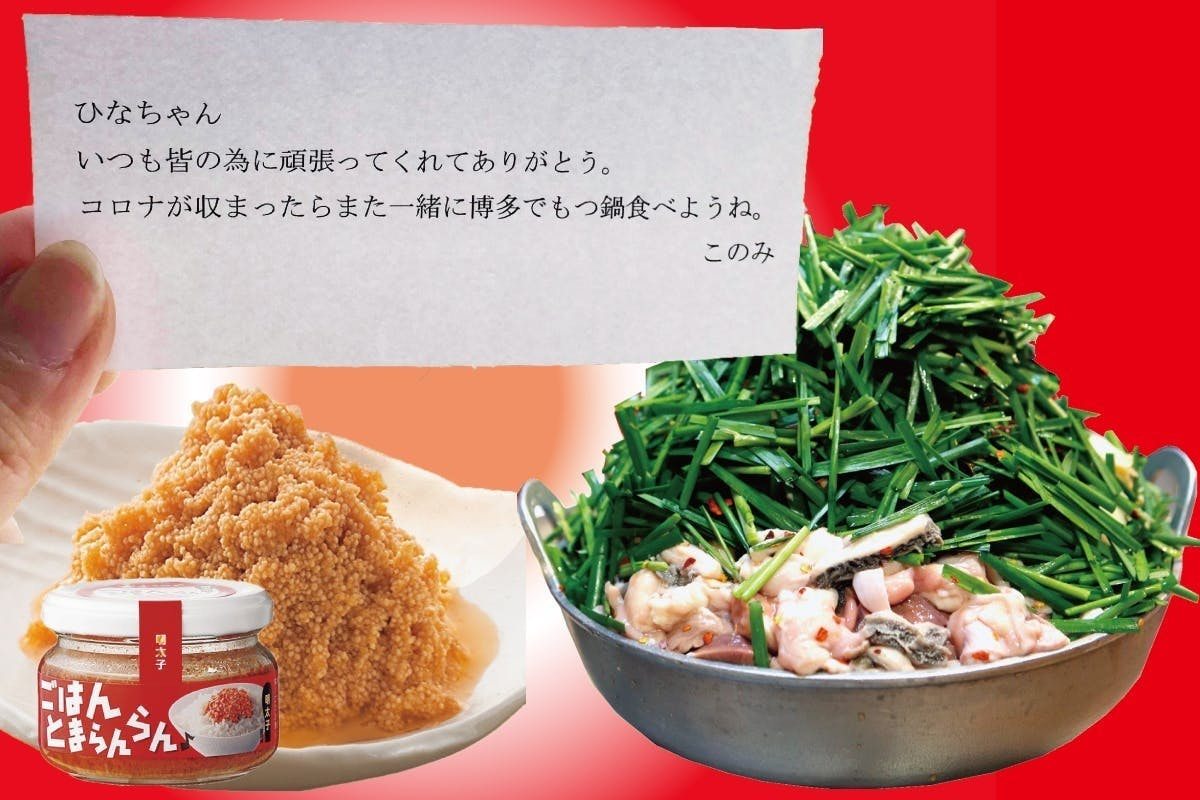 縁あるご友人、ご家族の医療従事者の方々へ、感謝のメッセージとあったかい博多名物のもつ鍋と明太子をお家でご家族と囲んでいただきたい。