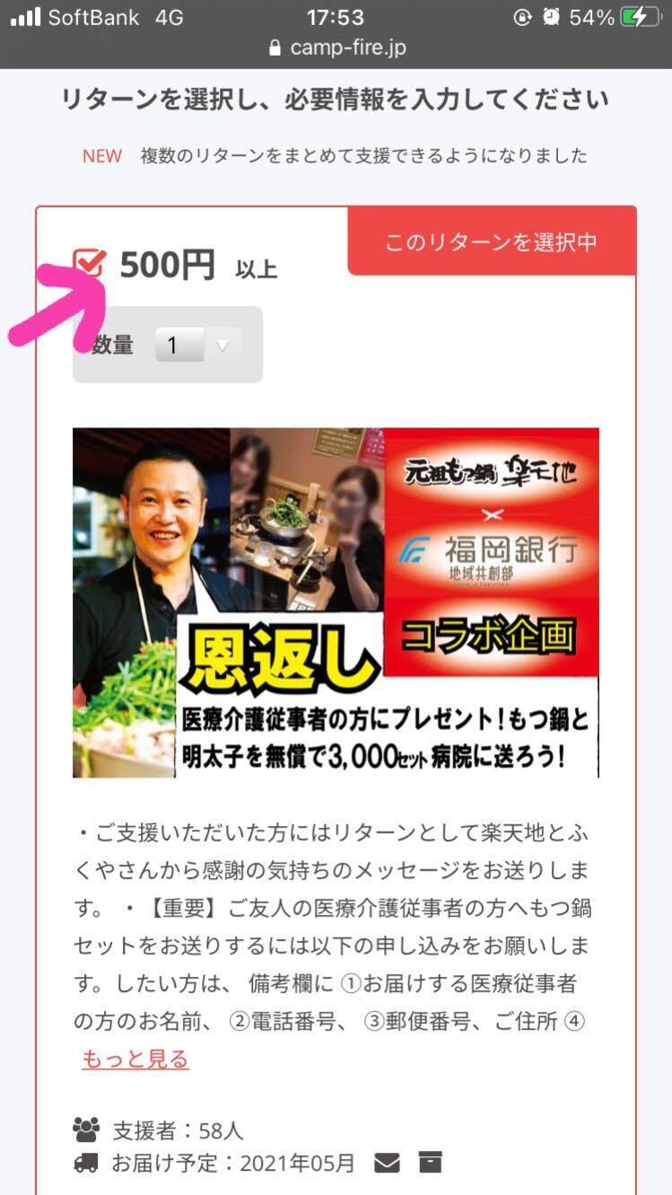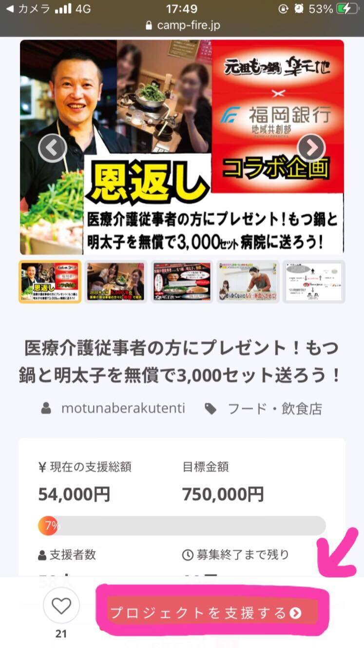 ・推薦いただいた医療従事者の方々へ4,500円相当のもつ鍋セットとふくやさんの明太子を感謝のメッセージ付きで無償で3,000名にお届けします。(なるべく早くお届けしたいので2週間で区切って1500セットづつ2回に分けます)