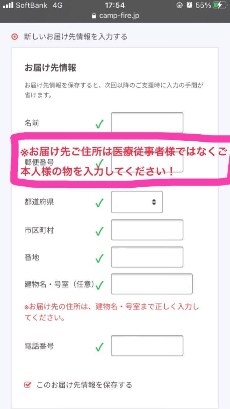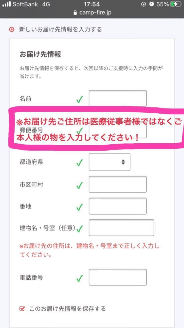 →★★クラウドファンディングお申込者(ご本人様)の名前★★を●●お届け先情報●●に入力する。