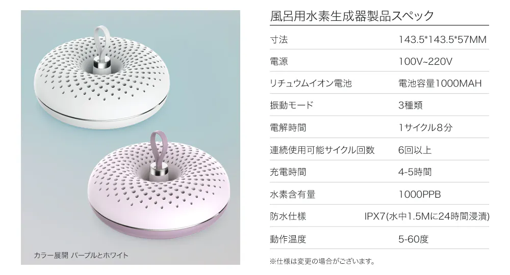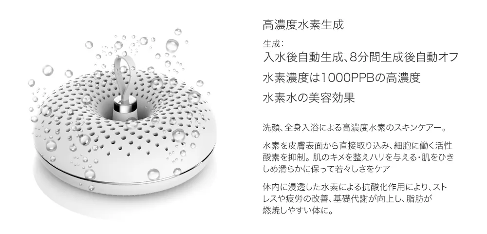 8分間水素のバブルを生成すると溶存水素量が約0.1ppmまで上昇。本体が自動停止後、35分経過しても、水素の量は80%保たれていますので、ゆったり温浴を楽しめます。