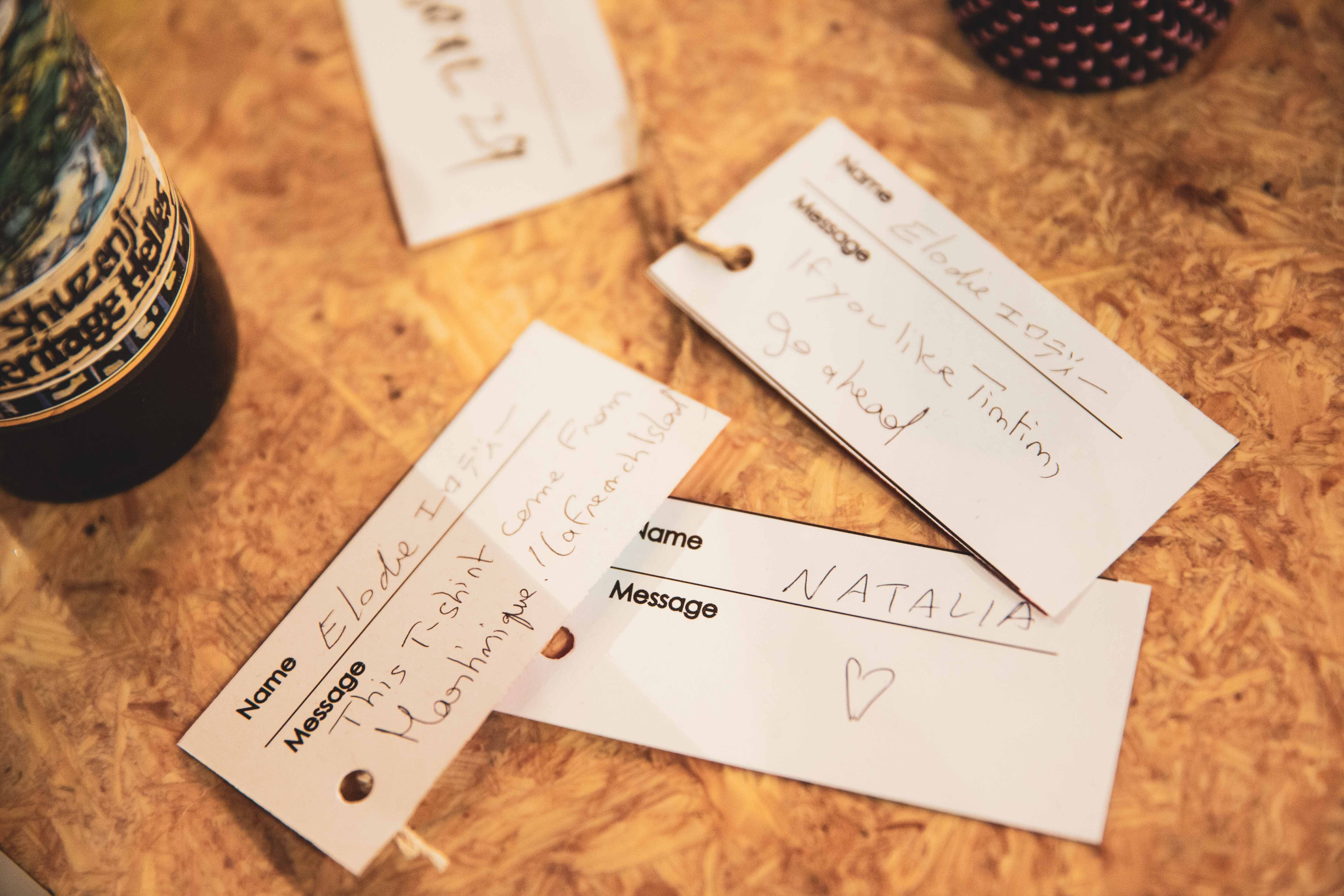 服を持ってきた人と、持ち帰る人がつながるための仕組みの一つが、アイテムにつけるタグ。持ち主は、服にまつわるエピソードや次の使い手へのメッセージが書かれたカードをつけて会場内にディスプレイします。