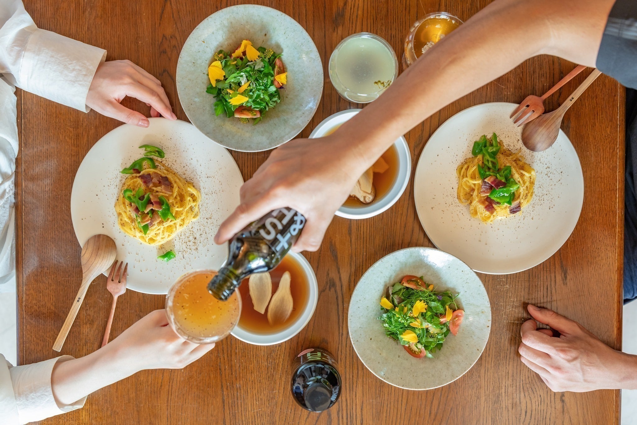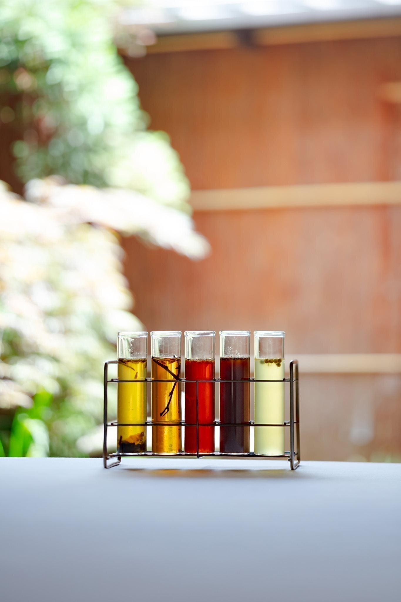 今回は、10種のハーブとスパイスを使ったオリジナルブレンドのコーラ【紫蘇コーラ&辛味】、わばらを中心に色と香りで深いリラックスを体感できる【わばら&甘味】、身体の調子を整えてくれる【政所茶&苦味】、寝る前など心身を穏やかにリセットしてくれる【阿波晩茶&酸味】気分転換や疲労回復におすすめの【水尾の柚子&塩味】の5種類を作りました。