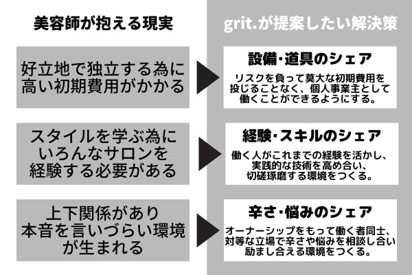 働く人同士がそれぞれの経験を活かして、莫大な初期費用を投じることなく独立することができる「設備・道具のシェア」、これまでの経験を活かして、技術をさらに高めあうことができるようになる「経験・スキルのシェア」、それぞれが独立したオーナーであるため対等な立場で相談し合える「辛さ・悩みのシェア」