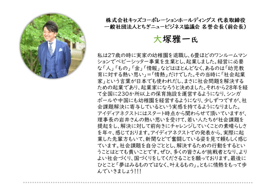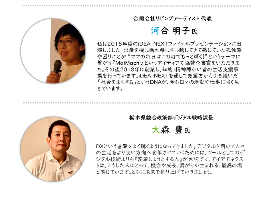 これまで59組もの若き挑戦者を輩出しており、発酵食品の製造販売を行う会社「株式会社アグクル」の開業をした小泉泰英氏や、大田原市で空き家を活用し、高齢者と若者をつなぐ「一般社団法人えんがお」を設立した濱野将行氏など、その他の卒業生も栃木県各地で活躍しています。
