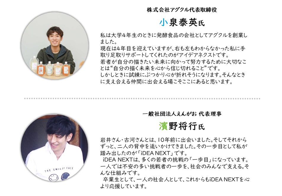 私たちは、そんな不安を抱えながらも挑戦する若者たちを支え、挑戦が生まれやすい環境を創っていくため、【iDEA→NEXT】を続けています。